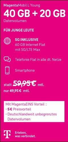 a1) Angebot gültig bei Neuabschluss bis 05.05.2023. t1) Monatlicher Grundpreis beträgt bei Buchung bis 31.05.2023 in den ersten 24 Monaten 29,95 € (mit Smartphone), ab dem 25. Monat 39,95 € (mit Smartphone). Mindestalter 18 Jahre, Höchstalter 27 Jahre. Ab dem Monat, der auf die Vollendung des 28. Lebensjahrs folgt, frühestens jedoch mit dem Ende der Mindestvertragslaufzeit, entfällt der Young Vorteil und MagentaMobil S Young wird automatisch zu den Konditionen des entsprechenden MagentaMobil Tarifs fortgeführt. Dabei gilt automatisch der um 10 € höhere Grundpreis. Bereitstellungspreis 39,95 € . Mindestlaufzeit 24 Monate. Während der Mindestvertragslaufzeit von 24 Monaten erhöht sich aktionsweise bei Buchung bis 31.05.2023 das monatliche Inklusivdatenvolumen von 10 GB um 5 GB auf 15 GB. Ab einem Datenvolumen von 15 GB, ab dem 25. Monat ab 10 GB, wird die Bandbreite im jeweiligen Monat auf max. 64 KBit/s (Download) und 16 KBit/s (Upload) beschränkt. t2) Voraussetzung ist das gleichzeitige Bestehen eines IP-Breitband-Vertrags, abgeschlossen ab dem 01.06.2015, mit einem monatlichen Grundpreis ab 29,95 €, z. B. MagentaZuhause S für 37,95 € /Monat, Bereitstellungspreis 69,95 €. Endet die Berechtigung für MagentaEINS durch Beendigung des Festnetz- oder Mobilfunk-Vertrags, entfällt der Rabatt und alle Vorteilsoptionen werden gelöscht. Ein Angebot von: Telekom Deutschland GmbH, Landgrabenweg 151, 53227 Bonn. t3) Monatlicher Grundpreis beträgt bei Buchung bis 31.05.2023 in den ersten 24 Monaten 49,95 € (mit Smartphone), ab dem 25. Monat 59,95 € (mit Smartphone). Mindestalter 18 Jahre, Höchstalter 27 Jahre. Ab dem Monat, der auf die Vollendung des 28. Lebensjahrs folgt, frühestens jedoch mit dem Ende der Mindestvertragslaufzeit, entfällt der Young Vorteil und MagentaMobil L Young wird automatisch zu den Konditionen des entsprechenden MagentaMobil Tarifs fortgeführt. Dabei gilt automatisch der um 10 € höhere Grundpreis. Bereitstellungspreis 39,95 €. Mindestlaufzeit 24 Monate. Während der Mindestvertragslaufzeit von 24 Monaten erhöht sich aktionsweise bei Buchung bis 31.05.2023 das monatliche Inklusivdatenvolumen von 40 GB um 20 GB auf 60 GB. Ab einem Datenvolumen von 60 GB wird die Bandbreite im jeweiligen Monat auf max. 64 KBit/s (Download) und 16 KBit/s (Upload) beschränkt. c1) Aktion für Neukunden bei Buchung bis 12.06.2023: Die congstar Allnet Flat M kostet monatlich 22 €. Mindestvertragslaufzeit 24 Monate. Einmaliger Bereitstellungspreis 15 €. Im Rahmen der Aktion wird die Bandbreite ab einem Datenvolumen von 15 GB statt 6 GB im jeweiligen Monat auf max. 32 Kbit/s im Download und Upload beschränkt. Bei Buchung im Aktionszeitraum ist die LTE 50 Option inklusive statt 5 €/Monat. Der Preisvorteil entfällt bei Tarifwechsel. Die LTE 50 Option ermöglicht das Surfen im LTE Netz und erhöht die Übertragungsgeschwindigkeit auf geschätzte max. 50 Mbit/s im Download und 25 Mbit/s im Upload. Vertragspartner der Mobilfunkdienstleistung: congstar – eine Marke der Telekom Deutschland GmbH, Bayenwerft 12–14, 50678 Köln. c2) Aktion für Neukunden bei Buchung bis 12.06.2023: Die congstar Allnet Flat L kostet monatlich 27 € statt 30 € . Mindestvertragslaufzeit 24 Monate. Einmaliger Bereitstellungspreis 15 € . Im Rahmen der Aktion wird die Bandbreite ab einem Datenvolumen von 20 GB statt 10 GB im jeweiligen Monat auf max. 32 Kbit/s im Download und Upload beschränkt. Bei Buchung im Aktions zeitraum ist die LTE 50 Option inklusive statt 5 € /Monat. Der Preisvorteil entfällt bei Tarifwech sel. Die LTE 50 Option ermöglicht das Surfen im LTE Netz und erhöht die Übertragungsgeschwindigkeit auf geschätzte max. 50 Mbit/s im Download und 25 Mbit/s im Upload.Vertragspartner der Mobilfunkdienstleistung: congstar – eine Marke der Telekom Deutschland GmbH, Bayenwerft 12–14, 50678 Köln. f1) Von exklusiven Vorteilen wie personalisierten Informationen, ausführlichen Analysen, Entspannungsklängen, Schlaftools und mehr profi tieren. Nur für neue Premium-Nutzer. Muss mit Gerät aktiviert werden. Angabe einer gültigen Zahlungsmethode erforderlich. Kostenlose Testversionmuss innerhalb von 60 Tagen ab Aktivierung des Geräts gestartet werden. Kostenlose Testversion kann vor Ablauf gekündigt werden, sodass keine Abonnementgebühren anfallen.