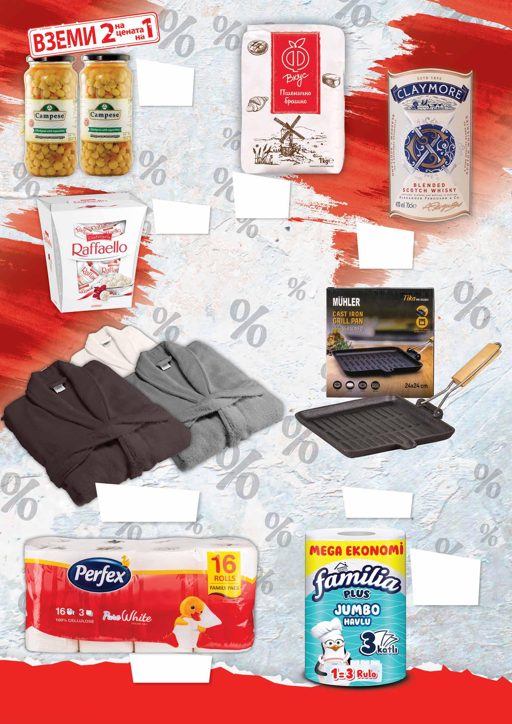 99 лв|бр 29 59 лв|бр 23.99 -51% 11 99 лв|бр 13 10.79 -32% 7 29 лв|бр 2 99 лв|бр 5 99 лв|оп. 1.19 -20% 0 95 лв|бр 7.36 -50% 3 68 лв|2 бр Шотландско уиски CLAYMORE 700 мл Грил тиган Tika MR-2416CI чугун, 24x24 см Халат за баня Кристал 100% памук S/M ; L/XL различни цветове Бонбони RAFFAELLO 230 г Кухненско руло FAMILIA Jumbo Economy трипластово, 1 бр Тоалетна хартия PERFEX Pure White 16 бр в опаковкa Бяло пшенично брашно Ф ВКУС 1 кг Нахут със зеленчуци CAMPESE 2 бр х 580 г Предложения за периода от 30 .03.2023 г до 22.00 ч на 09.04.2023 г важи само и единствено за супермаркети Фантастико - гр. Перник, гр. Ботевград, гр. Кюстендил и гр. София на бул. “Сливница” №65. Продуктите се продават в количества, обичайни за едно домакинство. Декорацията към продуктите не е включена в тяхната цена. ТВ „Фантастико“си запазва правото на промяна в цените. ТВ „Фантастико” не носи отговорност за допуснати печатни грешки. Количествата са лимитирани!