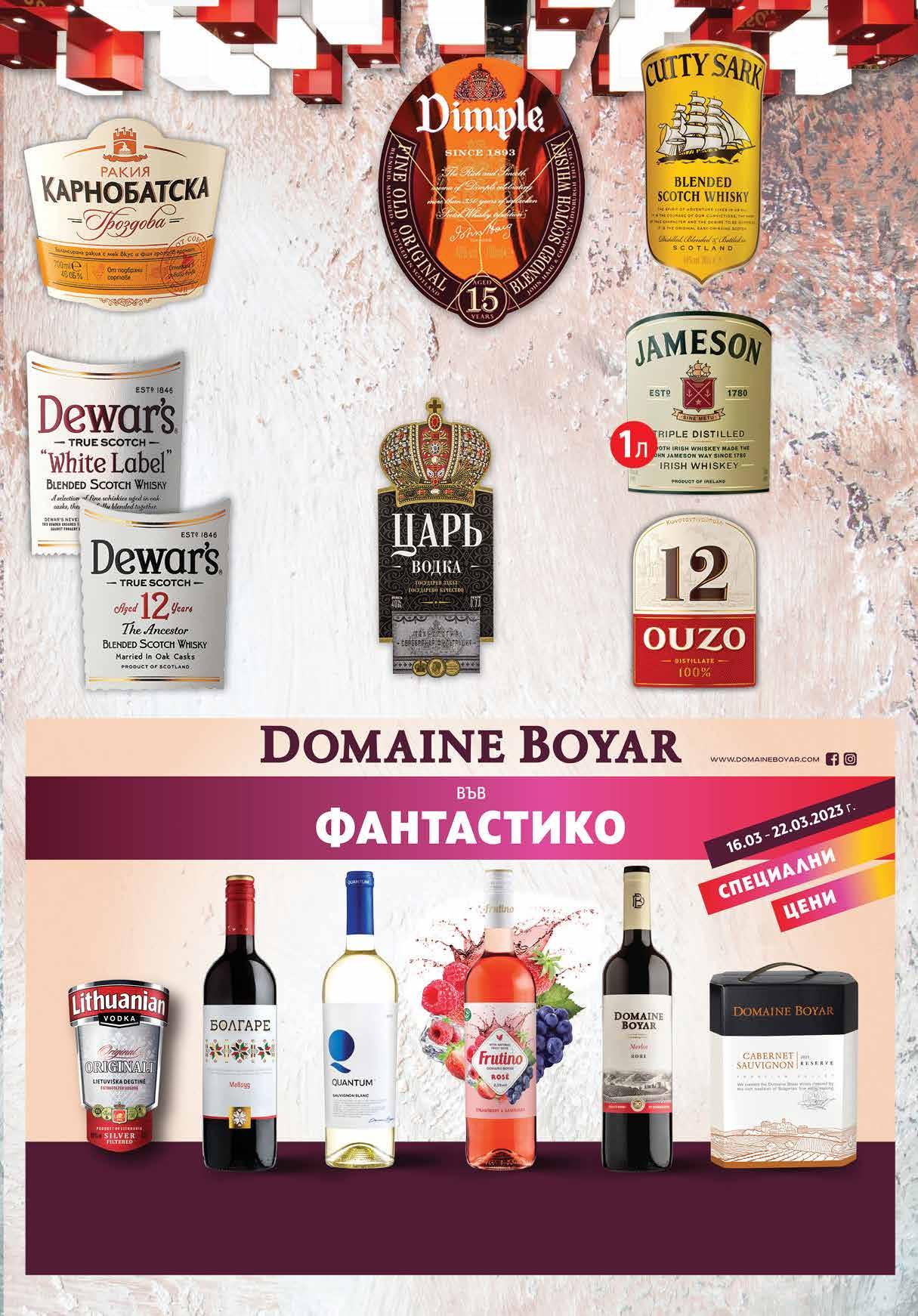 99 лв|бр 26.99 -22% 20 99 лв|к-т 19 4.69 -29% 3 29 лв|бр 3.39 -35% 2 19 лв|бр 2.89 -38% 1 79 лв|бр 10.84 -31% 7 48 лв|к-т Торта Червено кадифе 900 г кадифенЕфиренблат слепен с млечен крем и маскарпоне. Комплект мляно кафе LAVAZZA Crema e Gusto 4 бр x 250 г Бонбони TOFFIFEE 125 г Бира ЗАГОРКА Специално PET, 2 л Газирана напитка PEPSI/ MIRINDA различни видове 2 л Обезмаслител помпа лимон + пълнител лимон MEDIX 750 мл стр.2-3 ЧистИ Всичко по www.fantastico.bg fantastico.stores ОФЕРТА ЗА ПЕРИОДА от 16 .03.2023 г. до 22.00 ч . на 22.03.2023 г.