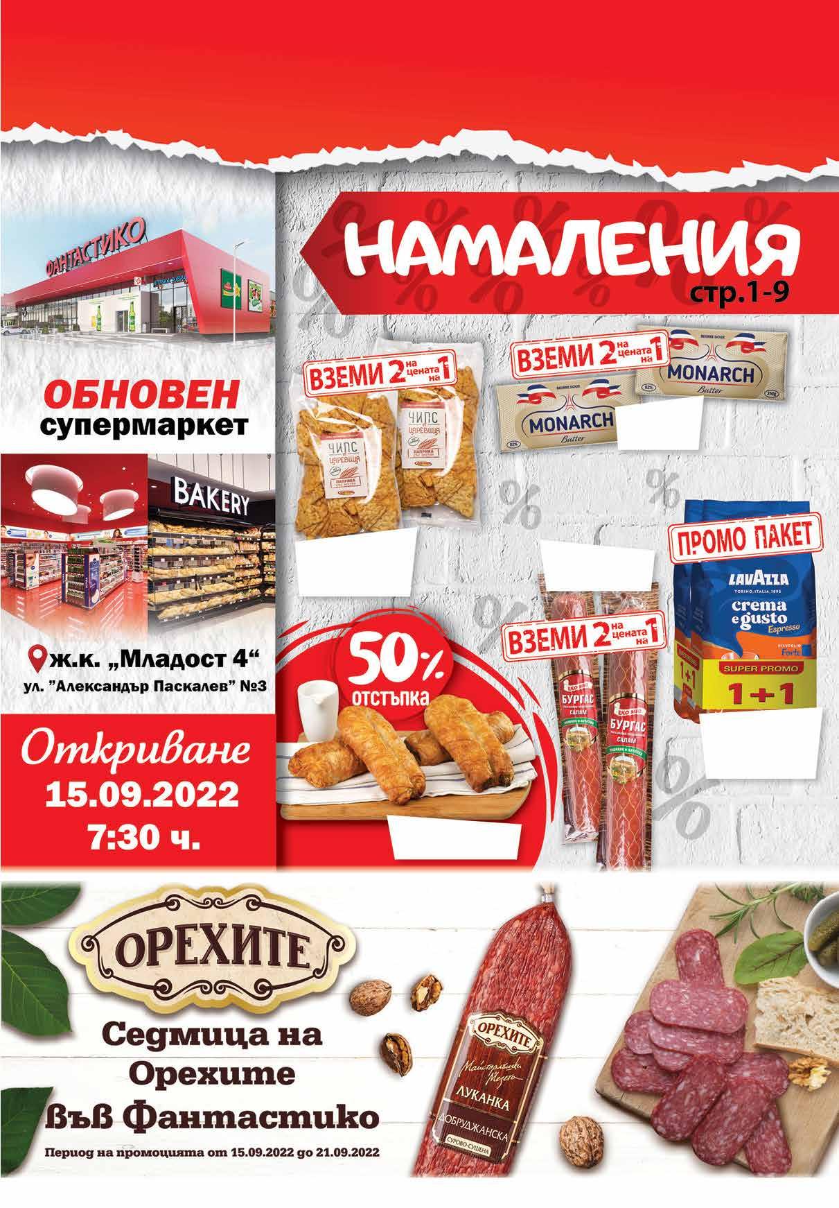1.49 -50% 0 74 лв|бр 38 99 лв|пп 48 лв|2бр 20.96 -50% 10 10.36 -50% 5 18 лв|2бр 4.36 -50% 2 18 лв|2бр Баничка със сирене; със сирене и спанак 120 г КравеMONARCHмасло 2 бр х 250 г Промо пакет кафе на зърна LAVAZZA CREMA E GUSTO FORTE 2 бр х 1 кг Чипс царевичен Гривас сол; паприка 2 бр* х 100 г *от един и същи вкус Салам Бургас ЕКО МЕС вакуум, 2 бр х 220 г fantastico.stores ОФЕРТА ЗА ПЕРИОДА от 25 .08.2022 г. до 22.00 ч . на 14.09.2022 г. www.fantastico.bg