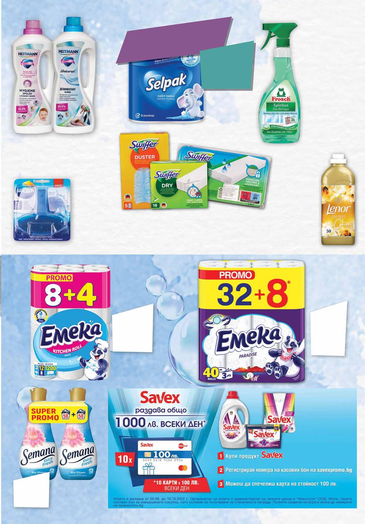 5 79 лв|бр 99 лв|бр1999 лв|бр13 8.49 -30% 5 89 лв|бр 99-40% sensitiveлв|бр 3 59 лв|бр -34% лв|бр69 8.89 -32% 5 99 лв|бр рулоКухненскоEMEKA опаковка8+4трипластовоWhiteбрв EMEKAхартияТоалетна в32+8трипластоваParadiseбрпакет ОмекотителLENOR различни1.4видовел;1.5л Всички кухненски рула с марка SELPAK с Резервана четка 5 бр; Сухи кърпи за под 10 бр; Мокри кърпи за под 18 бр; SWIFFER -25отстъпка% *предложениетоевалиднозамагазинитесъссиницени АроматизаторSANO различни видове кошница, 55 мл Гел 990 мл/ 1.1 л; Прах 2 кг; Капсули 14-15 бр за пране SAVEX различни видове Препарат помпа 500 мл; Препарат за прозорци 750 мл пълнител; Препарат за под 1 различнил видове FROSCH * предложението е валидно от 15.09.-21.09.2022г. 23ТВ „Фантастико” не носи отговорност за допуснати печатни грешки. Количествата са лимитирани! Предложенията са валидни до сряда 22.00ч. на 21.09.2022 г.