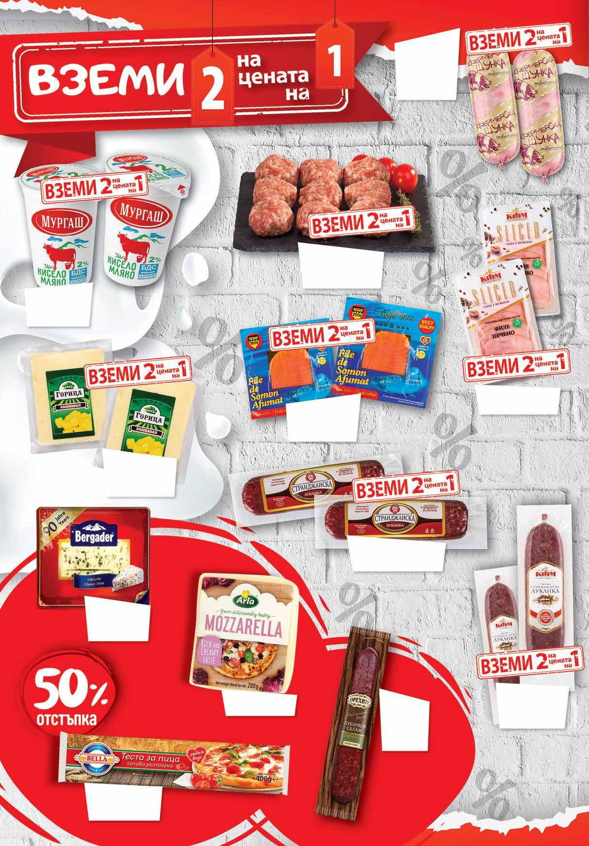 98 лв|2бр 25.96 -50% 12 2.80 -50% 1 40 лв|2бр 11.96 -50% 5 98 лв|2бр 13.96 -50% 6 98 лв|2бр 5.99 -50% 2 99 лв|бр 9.96 -50% 4 98 лв|2бр 5.39 -50% 2 лв|бр65 6.69 -50% 3 лв|бр29 1.76 -50% 0 88 лв|2бр 15.96 -50% 7 98 лв|2бр 9.56 -50% 4 78 лв|2бр 2.39 -50% 1 19 лв|бр Сьомга филе NEGRO пушенаслайс, 2 бр х 50 г Сурови кюфтета насипни от щандова витрина 2 бр х 70 г, СММ луканкаСтаробългарскаКФМ 2брвакуумх170 г Странджанска луканка ЕЛИТ МЕС вакуум, 2 бр х 250 г ОРЕХИТЕамбарицаСалам 180вакуум,г Моцарела ARLA 200 г ГОРИЦАотКашкавалкравемляко вакуум 2бр х 400 г КиселоМУРГАШмляко БДС, 2% 2 бр х 400 г ФермерскаСвинскашункаЖАР вакуум, 2 бр х 300 г Свинско филе печено КФМ слайс, 2 бр х 80 г Синьо BERGADERсирене масленост 50% 100 г Тесто за пица БЕЛЛА замразено, 400 г 2 Продуктите се продават в количества, обичайни за едно домакинство. Декорацията към продуктите не е включена в тяхната цена. ТВ „Фантастико“ си запазва правото на промяна в цените.