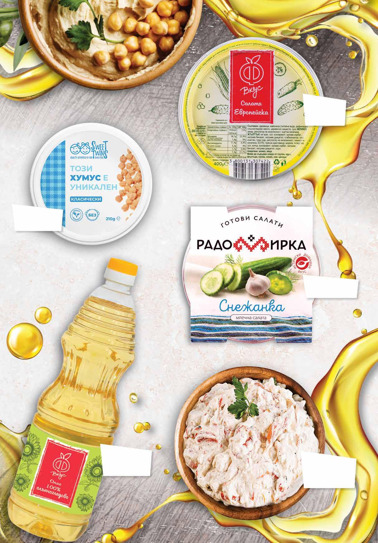 4.69 -25% 3 49 лв|бр 2.99 -20% 2 39 лв|бр 11.99 -25% 8 99 лв|кг 5.49 -27% 3 99 лв|бр 3.99 -25% 2 99 лв|бр Хумус SWEET TWINS различни видове 210 г Салата катък с печен пипер ВЕСЕЛИНА насипна от щандова витрина Салата Снежанка РАДОМИРКА 400 г Eвропейска салата Ф ВКУС кутия, 400 г Слънчогледово олио Ф ВКУС 1 л 3 ТВ „Фантастико” не носи отговорност за допуснати печатни грешки. Количествата са лимитирани! Предложенията са валидни до сряда 22.00ч. на 05.04.2023 г.