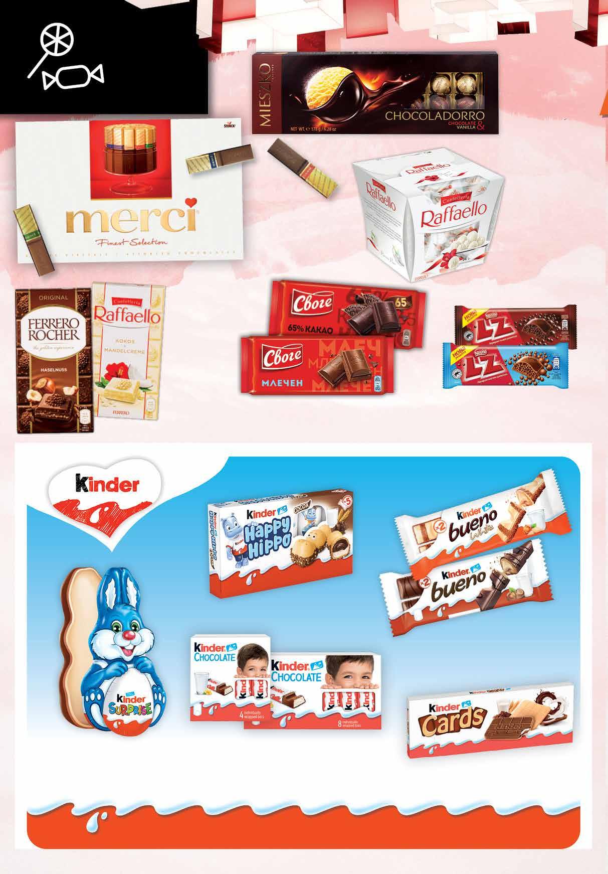 6.99 -21% 5 49 лв|бр 5.79 -25% 4 29 лв|бр 9.49 -26% 6 99 лв|бр 2.99 -26% 2 19 лв|бр 1 19 лв|бр 99 лв|бр 17.99 -27% 12 1.99 -30% 1 39 лв|бр 1.29 -31% 0 89 лв|бр 4.99 -26% 3 69 лв|бр 1.75 -32% 1 19 лв|бр 4.99 -20% 3 99 лв|бр 6.49 -30% 4 49 лв|бр Шоколад СВОГЕ различни видове 80-90 г Шоколад FERRERO ROCHER; RAFFAELLO кокос и бадем 90 г Бонбони CHOCOLADORRO 178 г Десерт KINDER Bueno различни видове 39-43 г Бонбони RAFFAELLO 150 г Бисквити KINDER Cards 128 г Шоколад LZ различни видове 36 г Десерт KINDER Happy Hippo 103 г Шоколад KINDER 50 г Шоколад KINDER 100 г Бонбони MERCI 400 г *Шоколадова фигура KINDER с изненада 75 г *количествата са лимитирани 14 Продуктите се продават в количества, обичайни за едно домакинство. Декорацията към продуктите не е включена в тяхната цена. ТВ „Фантастико“ си запазва правото на промяна в цените.