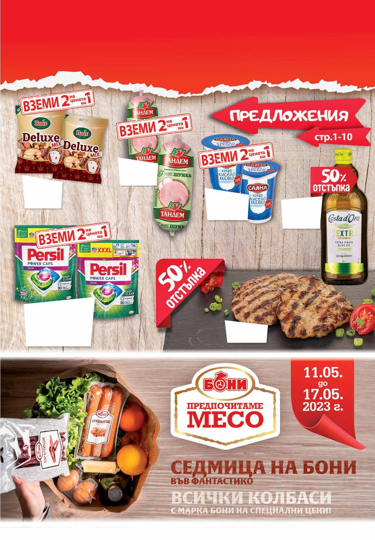 12.96 -50% 6 48 лв|2 бр 99 лв|бр 24.49 -50% 11 98 лв|2 оп. 69.96 -50% 34 13.96 -50% 6 98 лв|2 бр 2.39 -50% 1 19 лв|бр 3.36 -50% 1 68 лв|2 бр Шунка ТАНДЕМ Финес 2 бр х 300 г Свинска плескавица на скара Kапсули за пране PERSIL Power Caps Color 2* оп. х 46 бр в опаковка; Discs Color 2* оп. х 38 бр в опаковка; * от един и същи вид Печени ядки микс ROIS Deluxe 2 бр х 150 г Кисело мляко САЯНА масленост 3,6% 2 бр х 400 г Маслиново масло Екстра Върджин COSTA d‘ORO L‘extra 1 л www.fantastico.bg ОФЕРТА ЗА ПЕРИОДА от 11 .05.2023 г. до 22.00 ч . на 17.05.2023 г. fantastico.stores