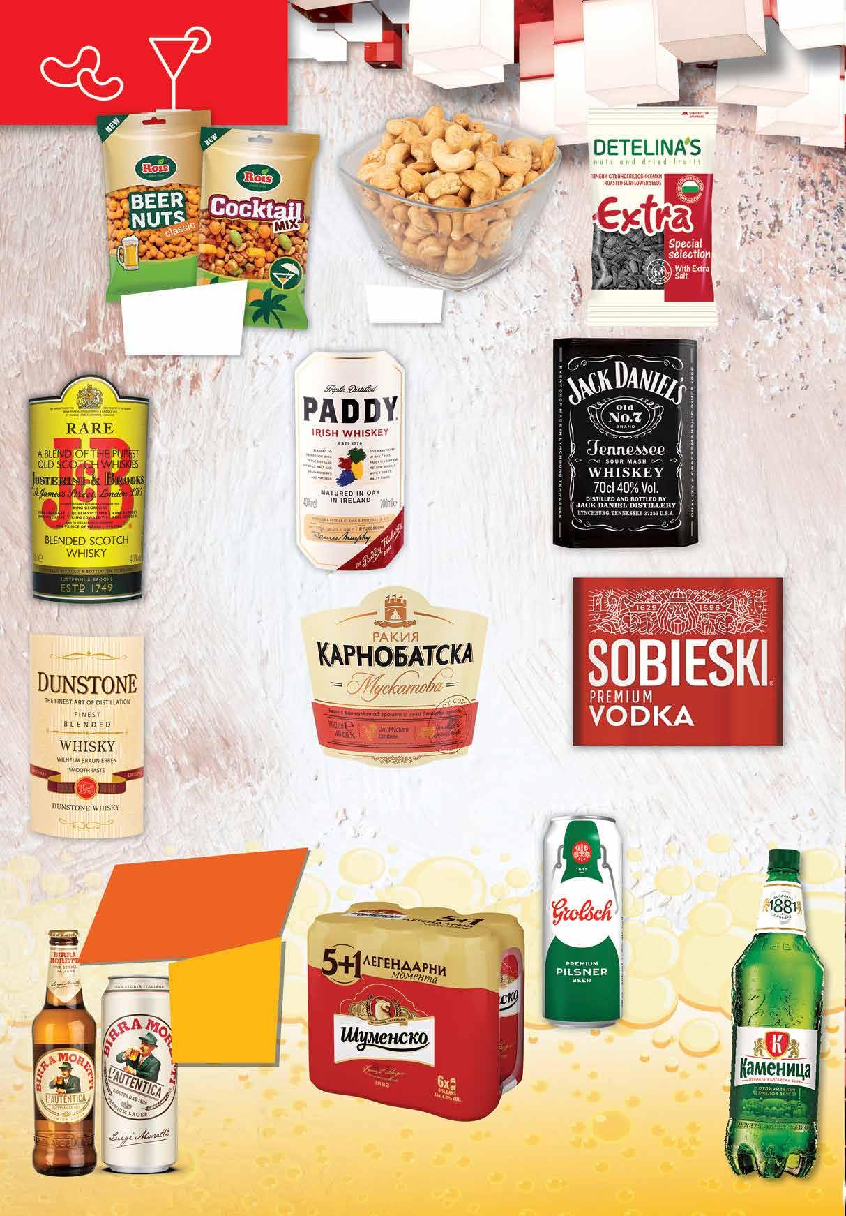 99 лв|бр 35.99 -33% 23 79 лв|бр 15.49 -23% 11 99 лв|бр 14.99 -26% 10 99 лв|бр 26.99 -29% 18 19.99 -50% 9 99 лв|бр 99 лв|бр 45.99 -23% 34 7.95 -25% 5 89 лв|бр 3.09 -22% 2 39 лв|бр 3.39 -29% 2 39 лв|бр 1.99 -30% 1 39 лв|бр 4.99 -30% 3 49 лв|бр фъстъци 4.39 -29% 3 09 лв|бр коктейл 99 лв|кг 32.99 -24% 24 Ракия КАРНОБАТ Мускатова 700 мл Водка SOBIESKI Premium 700 мл Уиски JACK DANIEL`S №7 700 мл Уиски DUNSTONE BLENDED 700 мл Шотландско уиски J&B 700 мл Ирландско уиски PADDY 700 мл Бира GROLSCH Premium Pilsner произход Холандия кен, 500 мл Всички бири с марка MORETTI с отстъпка минимум Бира КАМЕНИЦА PET, 2 л -30% Бира ШУМЕНСКО Мултипак кен , 6 бр х 500 мл Слънчоглед DETELINA‘S Extra черен, печен 200 г Ядки ROIS бирени фъстъци класик; коктейл микс 300 г Печено кашу 18 Продуктите се продават в количества, обичайни за едно домакинство. Декорацията към продуктите не е включена в тяхната цена. ТВ „Фантастико“ си запазва правото на промяна в цените.
