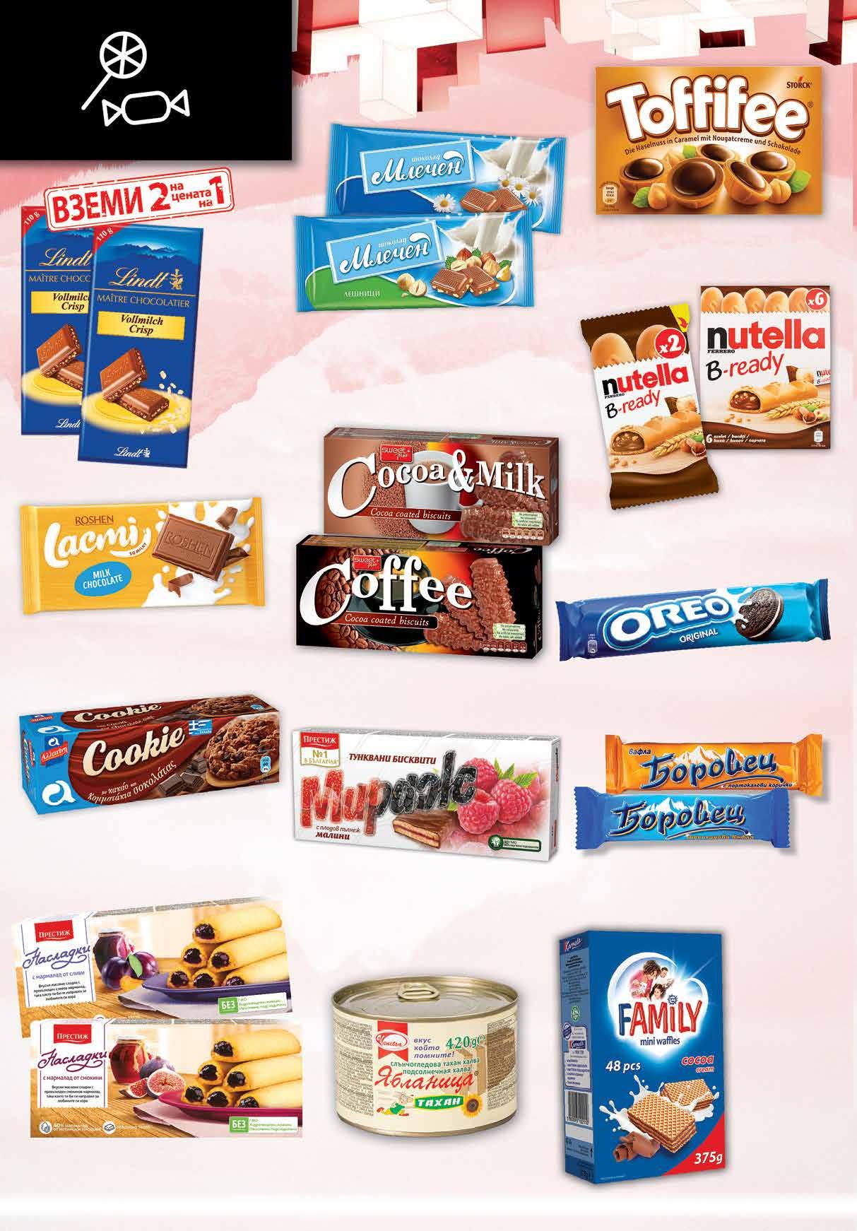 2.59 -34% 1 69 лв|бр 4.79 -27% 3 49 лв|бр 3.39 -38% 2 09 лв|бр 0.69 -33% 0 46 лв|бр 3.59 -25% 2 69 лв|бр 5.79 -24% 4 39 лв|бр 2.09 -33% 1 39 лв|бр 44 г 5.59 -32% 3 79 лв|бр 132 г 2.39 -33% 1 59 лв|бр 3.69 -32% 2 49 лв|бр 1.59 -27% 1 15 лв|бр 7.96 -50% 3 98 лв|2 бр 3.29 -27% 2 39 лв|бр 4.69 -29% 3 29 лв|бр Бисквити ALLATINI Cookie различни видове 175 г Бонбони TOFFIFEE 125 г Шоколад МЛЕЧЕН различни видове 80 г Шоколад LINDT млечен криспи; тъмен с лешник 2*бр х 110 г *от един и същи вид Десерт NUTELLA B-ready 44 г; 132 г Вафли FAMILY Мини различни видове 375 г Вафлa