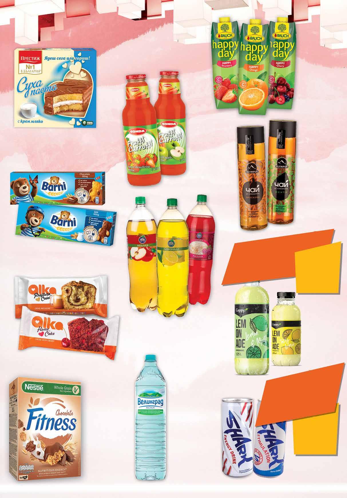 8.89 -32% 5 99 лв|бр 1.69 -41% 0 99 лв|бр 2.39 -25% 1 79 лв|бр 3.29 -39% 1 99 лв|бр 4.59 -34% 2 99 лв|бр 3.49 -22% 2 69 лв|бр 6.89 -27% 4 99 лв|бр 0.99 -30% 0 69 лв|бр 3.59 -22% 2 79 лв|бр отстъпка -25% Зърнена закуска NESTLE Fitness различни видове 300 г; 355 г; 375 г Суха паста Престиж различни видове 300 г Газирана напитка ВВВ различни видове PET, 2 л Нектар SONDA Frutti Carrotti различни видове 750 мл Плодова напитка ягода; вишна Нектар портокал RAUCH Happy Day 1л Минерална вода ВЕЛИНГРАД PET, 1,5 л Студен чай OLYMPUS различни видове PET, 500 мл Всички видове лимонада с марка CAPPY с Всички видове енергийни напиткис марка SHARK с Кексчета BARNI различни видове 150г отстъпка -22% *предложението е валидно за магазините със сини цени 17 ТВ „Фантастико” не носи отговорност за допуснати печатни грешки. Количествата са лимитирани! Предложенията са валидни до сряда 22.00ч. на 03.05.2023 г.