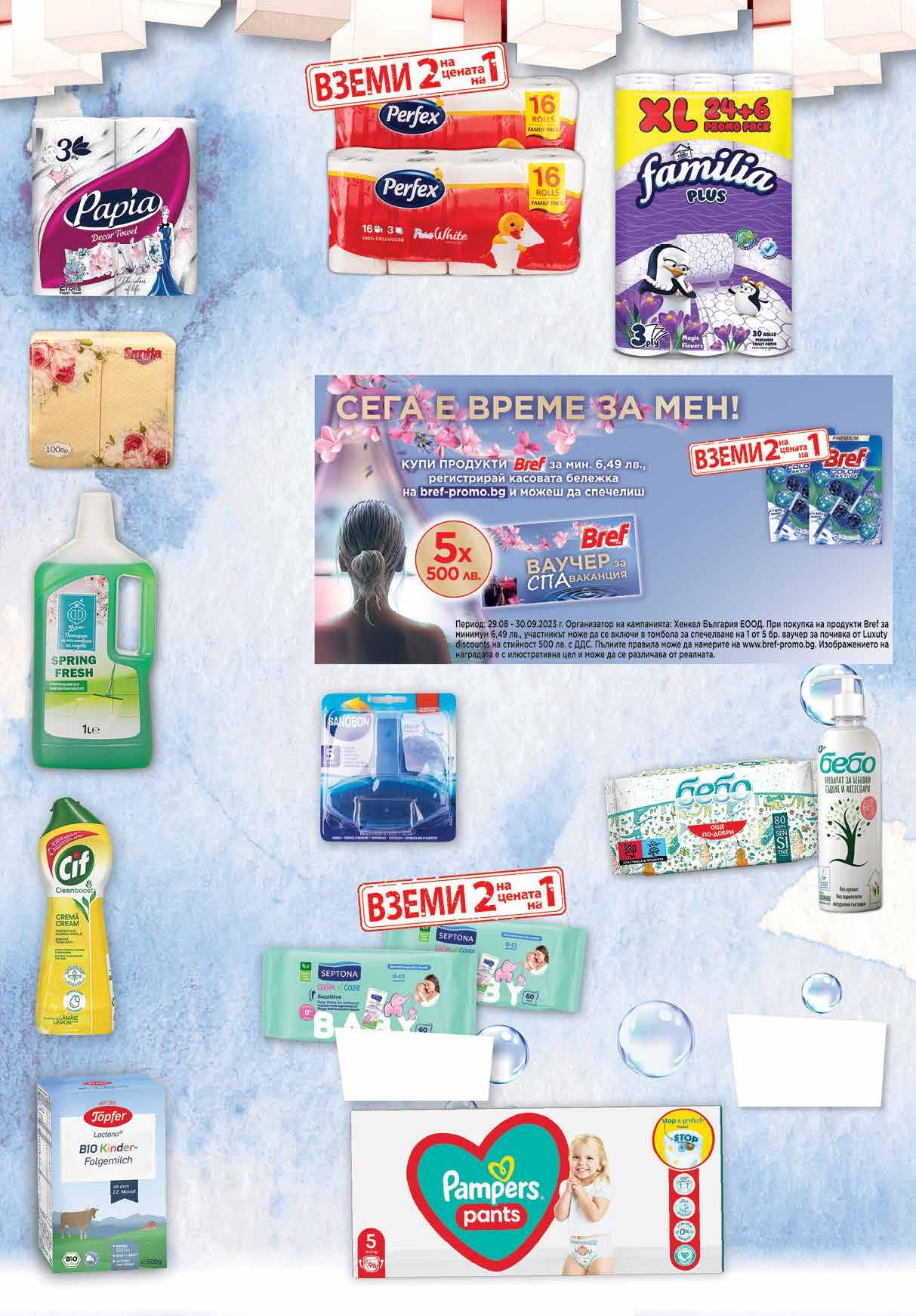 1 59 лв|оп. 2.55 -21% 1 99 лв|бр 24 лв|2 оп. 22.48 -50% 11 4.98 -50% 2 49 лв|оп. 99 лв|оп. 28.99 -44% 15 15.96 -50% 7 98** лв|2 оп. 8.49 -35% 5 49 лв|бр 4.85 -38% 2 99 лв|бр 8.36 -50% 4 18 лв|2 oп. 3 99 лв|оп. препарат 2 49 лв|оп. кърпи 99 лв|оп. гащички 46 99 лв|оп. пелени 49 99 лв|бр 23.99 -20% 18 Ароматизатор за WC BREF Color Aktiv различни видове 2* оп. х 2 бр х 50 г *от един и същи вид; Deluxe Magnolia 2* оп. х 2 бр х 50 г *от един и същи вид **офертата е валидна от 31.08. до 06.09.2023