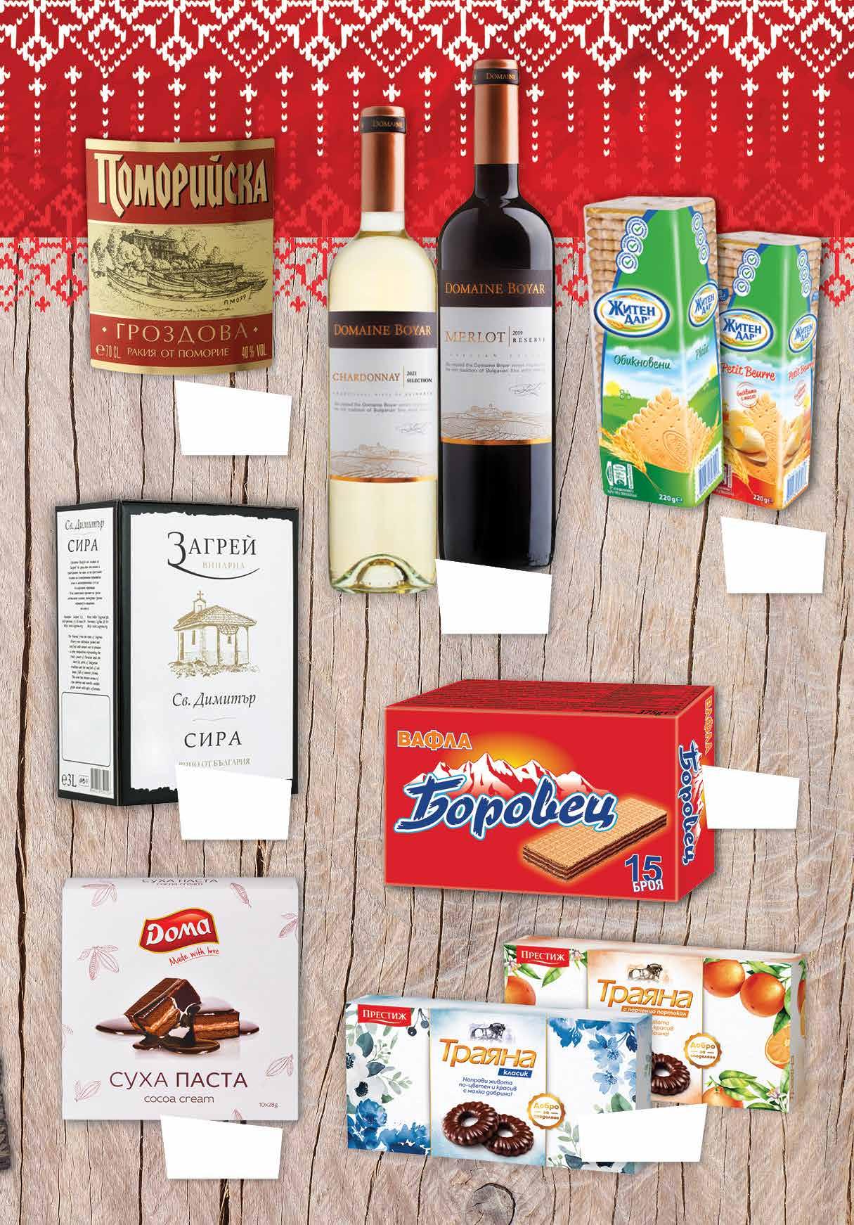 99 лв|бр 19.99 -25% 14 10.99 -27% 7 99 лв|бр 4.39 -31% 2 99 лв|бр 3.79 -26% 2 79 лв|бр 3.09 -32% 2 09 лв|бр 99 лв|бр 14.49 -24% 10 2.39 -25% 1 79 лв|бр Вино Сира; Мавруд и Димят ЗАГРЕЙ bag-in-box, 3 л Гроздова ракия ПОМОРИЙСКА 700 мл Вино DOMAINE BOYAR Резерва / Селекшън различни видове 750 мл Тунквани бисквити ТРАЯНА различни видове 160 г Суха паста DOMA различни видове 280 г Вафли БОРОВЕЦ 375 г Бисквити ЖИТЕН ДАР Обикновени; Petit Beurre 220 г 5 ТВ „Фантастико” не носи отговорност за допуснати печатни грешки. Количествата са лимитирани! Предложенията са валидни до сряда 22.00ч. на 08.03.2023 г.