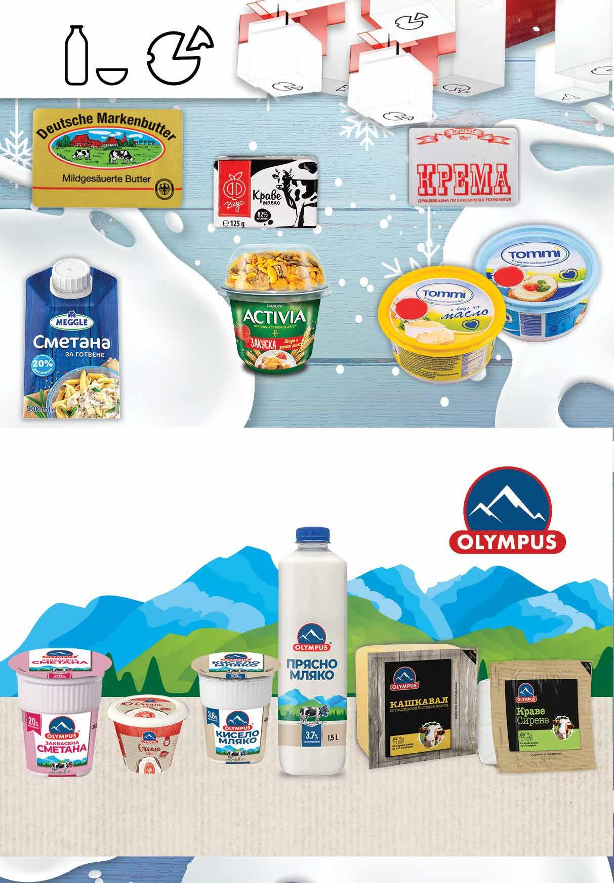 1.99 -20% 1 59 лв|бр 6.99 -32% 4 69 лв|бр 99 лв|бр 15.99 -25% 11 99 лв|бр 16.59 -21% 12 4.29 -25% 3 19 лв|бр 2.99 -33% 1 99 лв|бр 7.79 -35% 4 99 лв|бр 2.99 -33% 1 99 лв|бр kласик 3.29 -30% 2 29 лв|бр 2.29 -21% 1 79 лв|бр 5.89 -22% 4 59 лв|бр 2.29 -26% 1 69 лв|бр 4.39 -25% 3 29 лв|бр Сирене крема OLYMPUS натурално 200 г Крема МИЛТЕКС 125 г Краве масло Ф ВКУС 125 г Продукт за мазане TOMMI класик; с вкус на масло 500 г Краве масло DEUTSCHE MARKENBUTTER 250 г Прясно мляко OLYMPUS масленост 3,7% 1,5 л Kисело мляко OLYMPUS масленост 3,6% 400 г Заквасена сметана OLYMPUS масленост 20% 350 г Млечна сметана MEGGLE за готвене масленост 20% 500 мл ACTIVIA Закуска различни видове 198 г Сирене от краве мляко OLYMPUS вакуум, 700 г Кашкавал от краве мляко OLYMPUS вакуум, 400 г 8 Продуктите се продават в количества, обичайни за едно домакинство. Декорацията към продуктите не е включена в тяхната цена. ТВ „Фантастико“ си запазва правото на промяна в цените.
