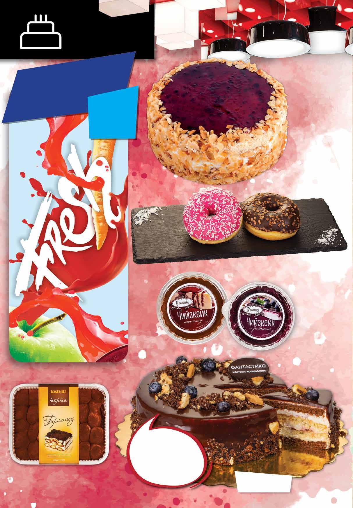 13.99 -28% 9 99 лв|бр 99 лв|бр 20.99 -33%133.79 -31% 2 59 лв|бр 99 лв|бр 16.99 -23% 120.79 -25% 0 59 лв|бр ТирамисуТортаTASTEIT 560 г РОМАНТИКАЧийзкейк 120шоколадборовинка;г Бисквитена торта с боровинки 900 г Нежен млечен крем с бисквитки с масло, неповторим вкус на боровинка и топяща шоколадовасезаливка. МЛЕЧЕНТорта ЕКЛЕР 750 г цвекло,Фрешябълкаиморковс отстъпка -20% *предложението е валидно за съсмагазинитесиницени Донът с шоколадова глазура; с ягодова глазура 55 г 12 Продуктите се продават в количества, обичайни за едно домакинство. Декорацията към продуктите не е включена в тяхната цена. ТВ „Фантастико“ си запазва правото на промяна в цените.