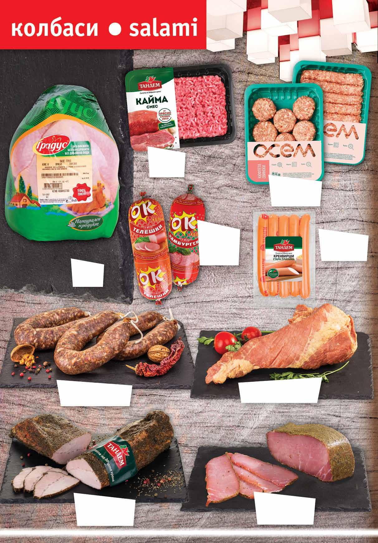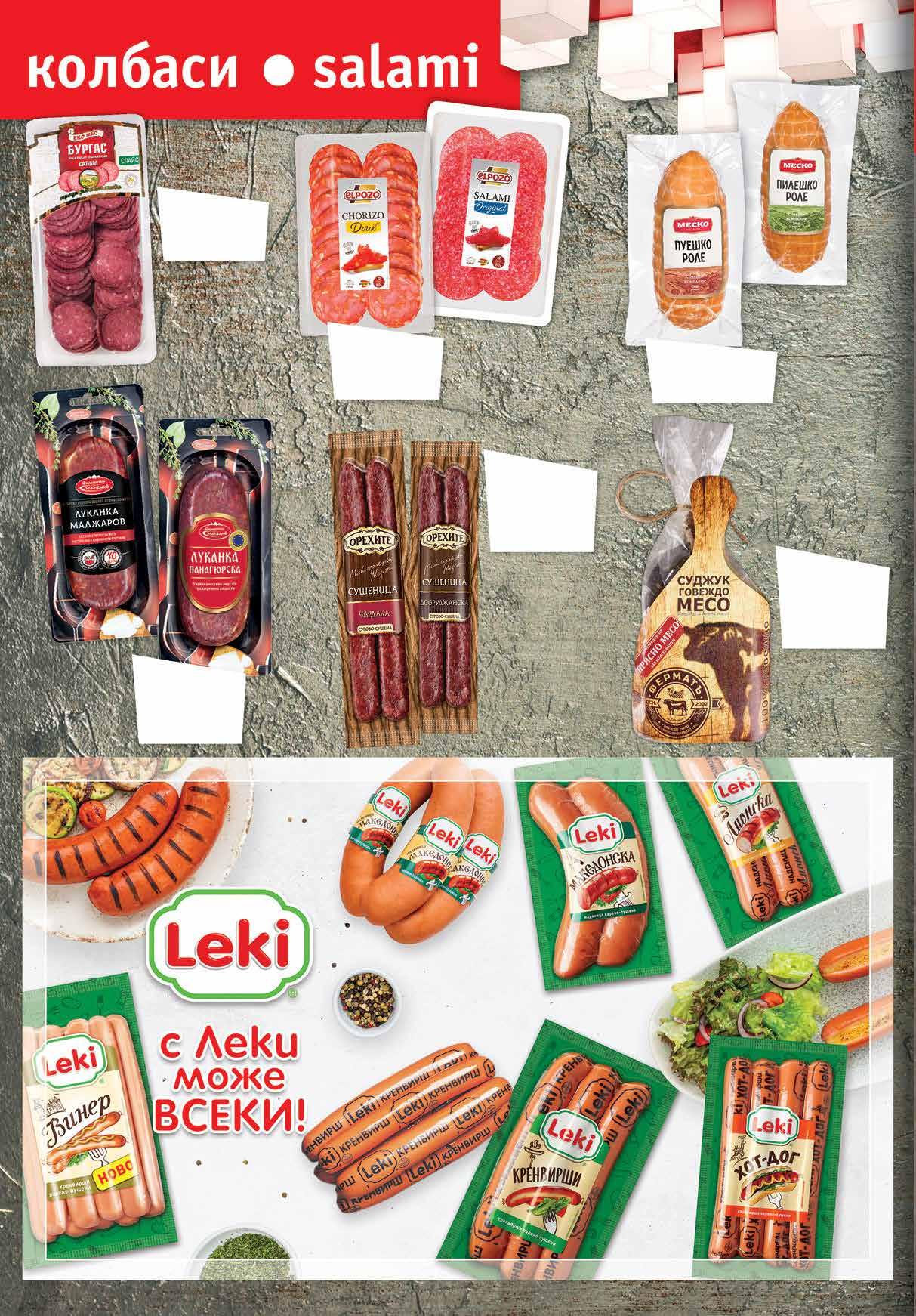 7.99 -31% 5 49 лв|бр 9.99 -30% 6 99 телешкалв|бр 5.99 -33% 3 99 лв|бр 10.99 -27% 7 99 лв|кг 8.99 -22% 6 99 лв|бр 8.99 -22% 6 99 панагюрскалв|бр 5.79 -31% 3 99 лв|бр 12.99 -30% 8 99 лв|кг 12.49 -32% 8 49 лв|кг 6.99 -21% 5 49 пилешколв|бр 7.49 -20% 5 99 пуешколв|бр 4.69 -25% 3 49 лв|бр 4.39 -31% 2 99 лв|бр 4.49 -33% 2 99 хот-доглв|бр 4.49 -33% 2 99 лв|бр 99 лв|кг 42.99 -25% 31 ОРЕХИТЕСушеница вакуум,ТелешкаЧардака;Добруджанска;180г наденицаЛионска вакуум,400г Роле МЕСКО пуешко;вакуум,пилешко270г Кренвирши класик 300 г; хот-дог 320 г вакуум Кренвирши насипни от витринащандова МАДЖАРОВПанагюрскаКласик;Луканка вакуум, 190 г ВинерКренвирши вакуум, 400 г Македонсканаденица насипнавакуум; ЕКОБургасСаламМЕС слайс, 180 г Чоризо Doux; Салам ELPOZOOriginal слайс, 80 г ФЕРМАТЪсуджукГовежди насипен витринащандоваот 8 Продуктите се продават в количества, обичайни за едно домакинство. Декорацията към продуктите не е включена в тяхната цена. ТВ „Фантастико“ си запазва правото на промяна в цените.