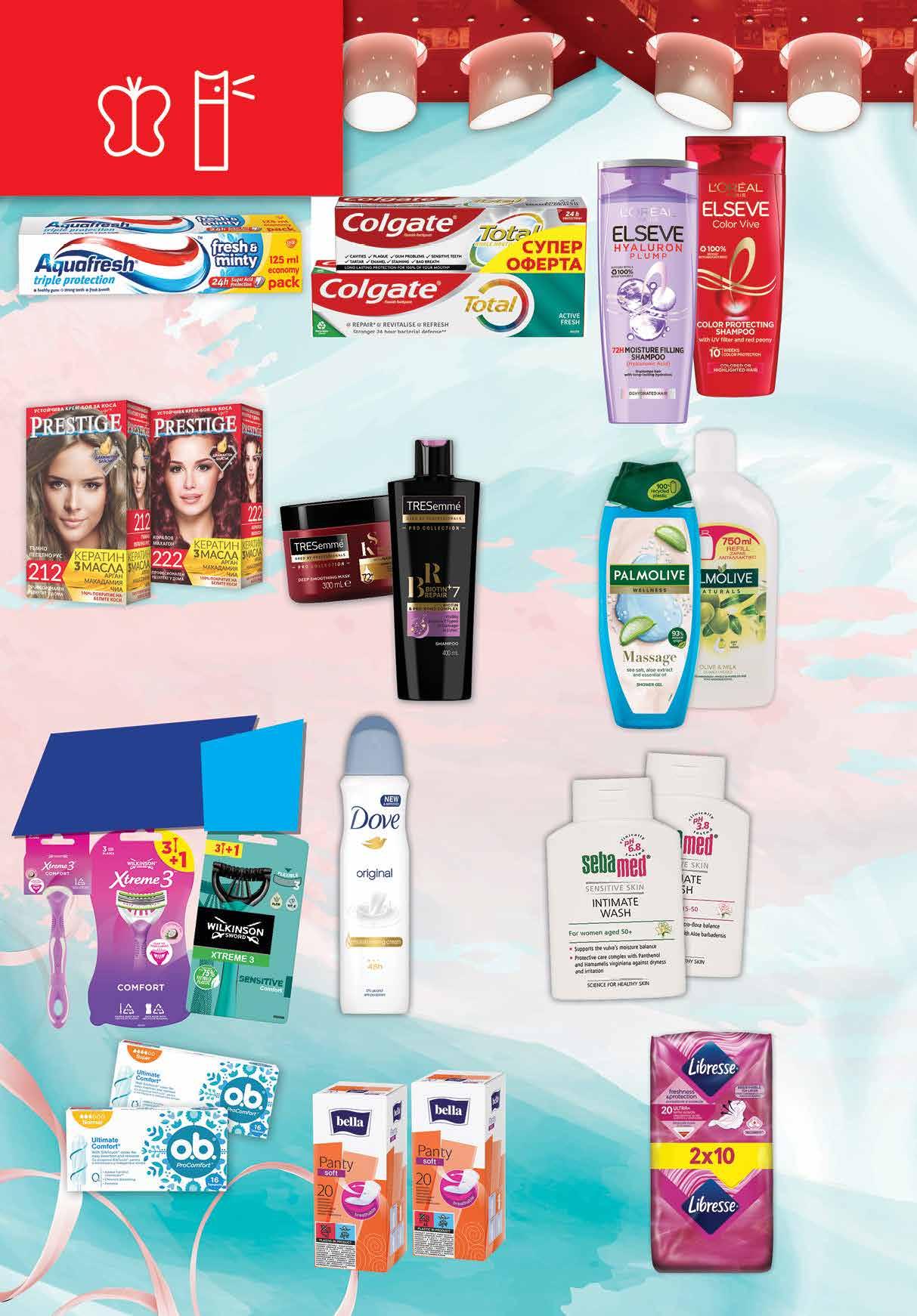 5 39 лв|бр 5 69 dreamlonghYaluron;лв|бр 9.99 -35% 6 49 лв|брмаска 9.99 -35% 6 49 лв|бр3.69 -29% 2 59 лв|бр 5 39 лв|k-t 7.99 -41% 4 69 душлв|бргел 7.59 -34% 4 99 лв|брсапун 39 лв|бр Ph 6.8 15.59 -14% 13 99 лв|бр Ph 3.8 17.29 -13%145.55 -35% 3 59 лв|бр 6.49 -38% 3 99 лв|бр 3.08 -50% 1 54 лв|2оп. 4 89 лв|бр 2 29 лв|бр Шампоан 250 мл; Балсам 200 мл; ELSEVE различни видове Течен пълнителсапун750 мл; Душ гел 500 мл PALMOLIVE различни видове Интимен SEBAMEDгел Ph3.8; Ph6.8 200 мл Балсам 400 мл; Шампоан 400 мл; Маска 300 мл TRESEMME различни видове Боя за PRESTIGEкоса различнивидове115мл LIBRESSEпревръзкиДамски DUO 16различниPACKвидове-20бр *предложението е валидна за магазините със зелени цени рол-онДео 50 мл; Стик 40 мл; Спрей 150 мл DOVE видоверазлични Паста за AQUAFRESHзъби Active White; Fresh&Minty; Herbal; Active Fresh 125 мл пастаКомплектзазъбиCOLGATE Total 100 мл + Total Enamel 75 мл тампониДамски O.B. различниProComfortвидове16бркутия BELLAпревръзкиДамски ежедневни Софт 2 оп. х 20 бр самобръсначкиВсички с маркаXtremeWILKINSON3с отстъпка -30% 20 Продуктите се продават в количества, обичайни за едно домакинство. Декорацията към продуктите не е включена в тяхната цена. ТВ „Фантастико“ си запазва правото на промяна в цените.