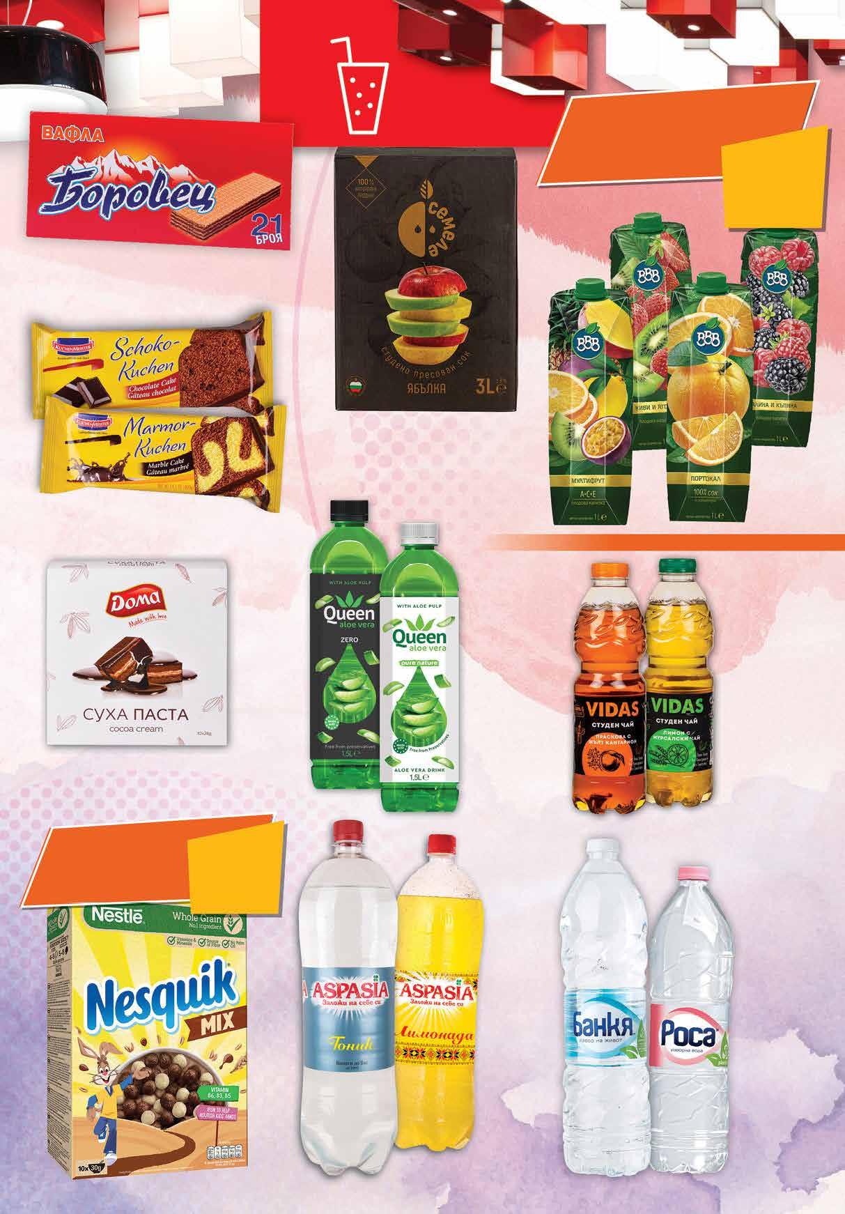 6.99 -31% 4 79 лв|бр 3.99 -30% 2 79 лв|бр 5.99 -33% 3 99 лв|бр 0.99 -24% 0 75 лв|бр 6.99 -21% 5 49 лв|бр 1.79 -44% 0 99 лв|бр 4.79 -22% 3 69 лв|бр 3.59 -44% 1 99 лв|бр *предложението е валидно за магазините със зелени цени Студен чай VIDAS различни видове 1 л Всички сокове, нектари и плодови напитки с BBBмаркаoт1л с зърнениИзбранизакускисмаркаNESTLEс отстъпка отстъпка СокСЕМЕЛЕЯбълка bag-in-boxпресованстудено3л -26% -28% ASPASIAнапиткаГазирана 2видоверазличнил РОСАИзворнаводаМинералнаБАНКЯ;вода 1,5 л минимум QUEENНапитка Алое PET,видоверазличниВера1,5л Суха DOMAпаста различни видове 280 г KUCHENMEISTERКейк различни видове 400 г БОРОВЕЦВафла различни видове 550-630 г 15ТВ „Фантастико” не носи отговорност за допуснати печатни грешки. Количествата са лимитирани! Промоцията е валидна до сряда 22.00ч. на 24.08.2022 г.
