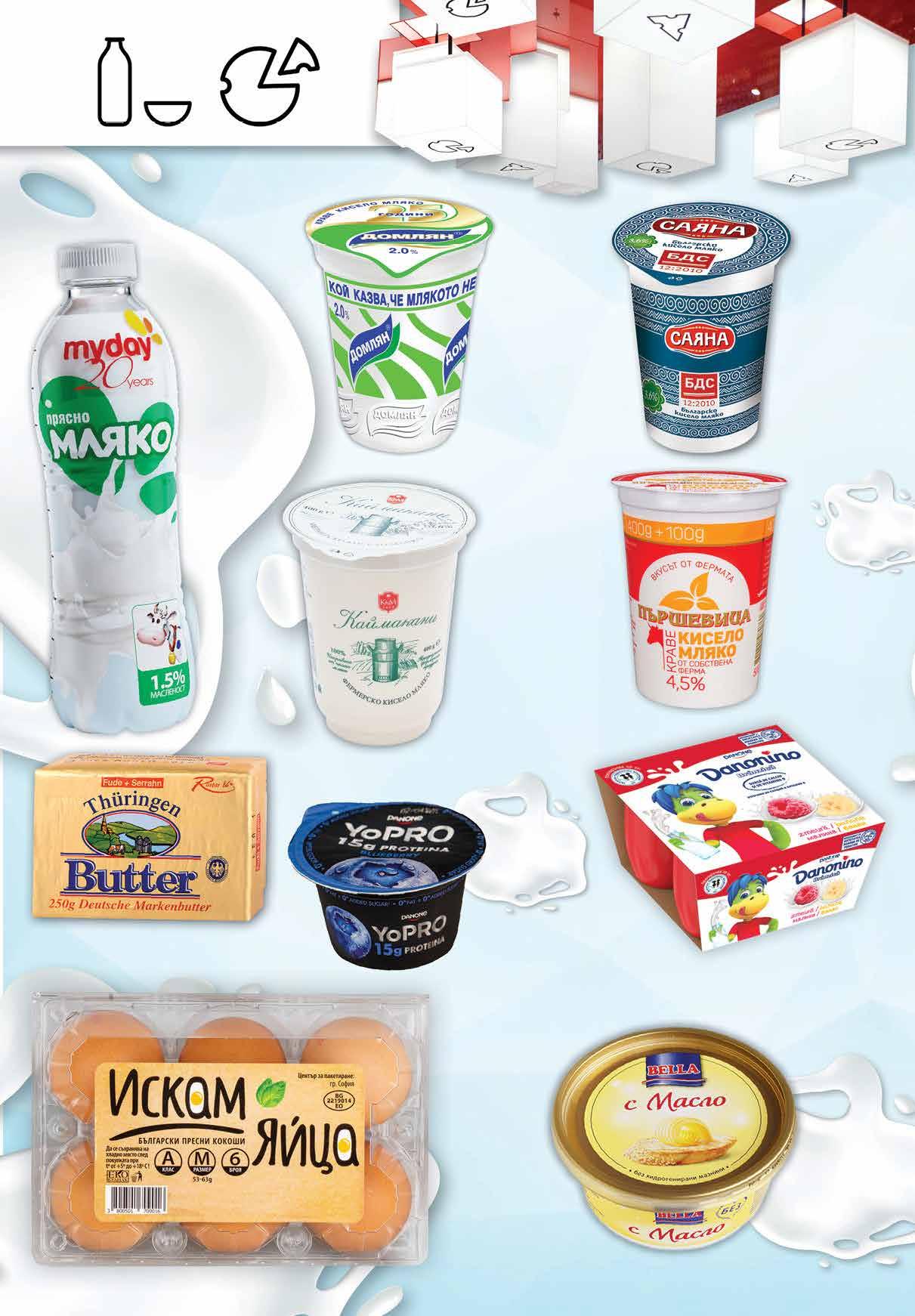 1.45 -20% 1 15 лв|бр 1.79 -33% 1 19 лв|бр 2.69 -20% 2 15 лв|бр2.39 -25% 1 79 лв|бр 1.49 -33% 0 99 лв|бр 1.49 -22% 1 15 лв|бр 9.49 -40% 5 69 лв|бр 3.99 -40% 2 39 лв|бр 2.89 -24% 2 19 лв|бр 2.39 -22% 1 85 лв|бр ИСКАМЯйца ЯЙЦА размер M 6 бр в опаковка YOPROЙогурт 160видоверазличниг Краве THÜRINGENмасло 250 г Кисело мляко САЯНА масленост 3,6% по БДС, 400 г Кисело КАЙМАКАНИмляко 400масленостфермерско3,6%г Кисело ДОМЛЯНмляко масленост 2% 500 г Кисело ПЪРШЕВИЦАмляко масленост 4,5% 400 г + 100 г Прясно мляко MY DAY масленост 1,5% 1 л DANONINOДесерт различни видове 4 бр х 50 г МаргаринBELLA с масло 400 г 4 Продуктите се продават в количества, обичайни за едно домакинство. Декорацията към продуктите не е включена в тяхната цена. ТВ „Фантастико“ си запазва правото на промяна в цените.
