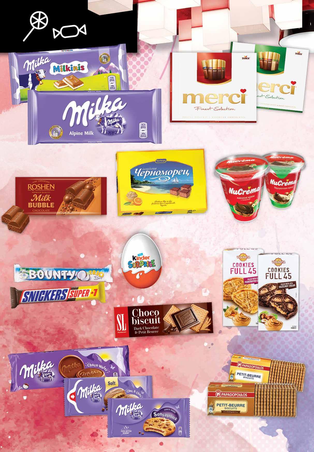 2.09 -28% 1 49 лв|бр 2.99 -33% 1 99 лв|бр 1.99 -25 % 1 49 лв|бр 2.59 -27% 1 89 лв|бр 3.69 -27% 2 69 лв|бр 4.29 -37% 2 69 лв|бр 1.89 -31% 1 29 лв|бр 8.49 -24% 6 39 лв|бр 6.49 -38% 3 99 лв|бр 4.39 -34% 2 89 лв|бр 1.79 -22% 1 39 лв|бр БонбониMERCI различни видове250г БисквитиPAPADOPOULOSPetit-Beurre класик; пълнозърнести225г яйцеШоколадовоKINDER 20Surpriseг Шоколад MILKA различни видове 100 г ЧЕРНОМОРЕЦБонбони 187 г Десерт BOUNTY Trio 85 г; SNICKERS Super +1 112,5 г Бисквити SL Choco Biscuit различни видове125г Бисквити FULL 45 различни видове150г ROSHENШоколад Bubble различни видове80г NUCREMAКрем различни видове400г Бисквити MILKA Choc & Choc 150 г; Choco Wafer 150 г; Sensations 156 г 14 Продуктите се продават в количества, обичайни за едно домакинство. Декорацията към продуктите не е включена в тяхната цена. ТВ „Фантастико“ си запазва правото на промяна в цените.