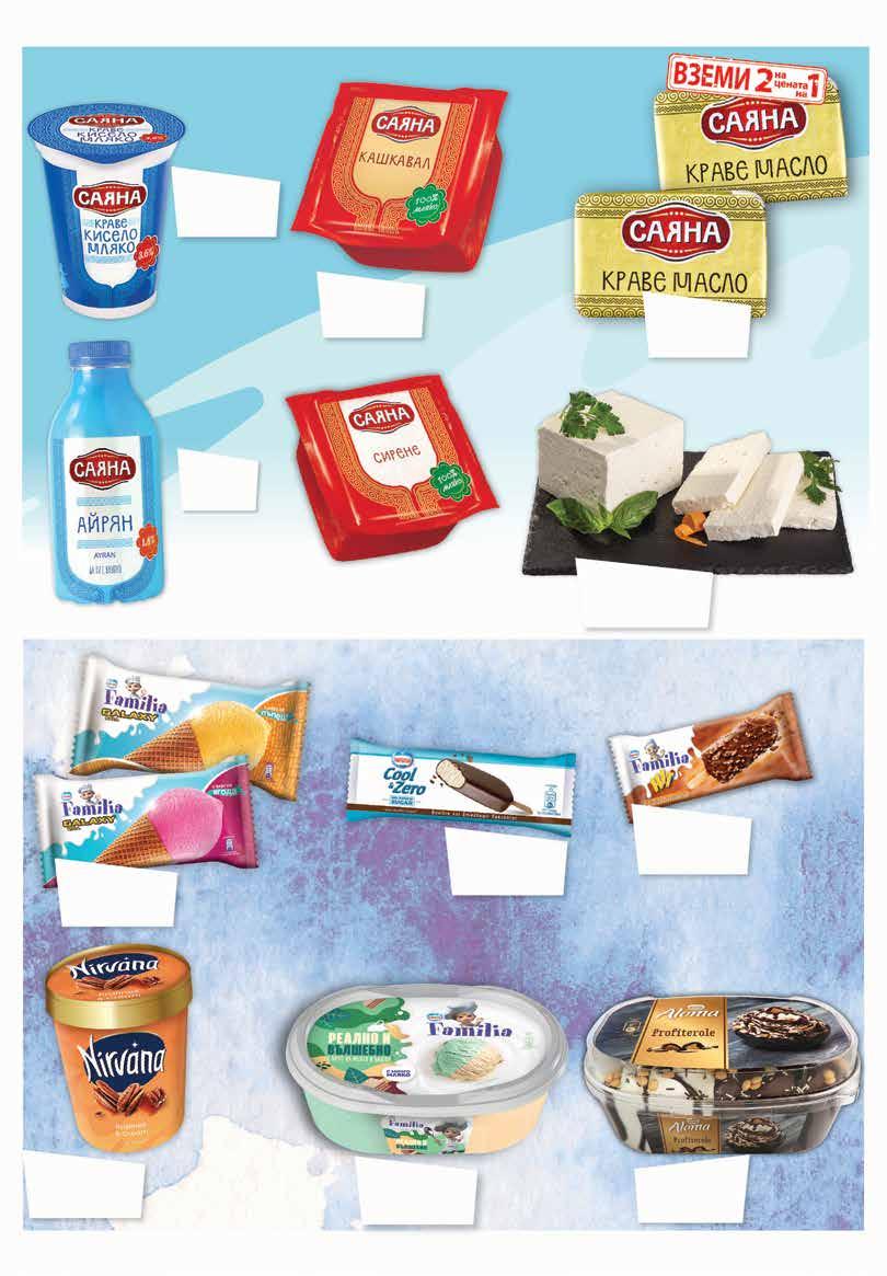 1.69 -23% 1 29 лв|бр 3.75 -20% 2 99 лв|бр 5.39 -20% 4 29 лв|оп. 2.19 -22% 1 69 лв|бр 1.75 -20% 1 39 лв|бр 6.89 -37% 4 29 лв|бр 2.15 -30% 1 49 лв|бр 2.95 -22% 2 29 лв|бр 4.19 -28% 2 99 лв|бр 2.69 -26% 1 99 лв|бр 5.45 -26% 3 99 лв|бр 4.89 -34% 3 19 лв|бр 6.29 -30% 4 39 лв|бр Кисело мляко БОЖЕНЦИ масленост 2,2% 400 г Кисело мляко ВЕРЕЯ масленост 3,6% 1 кг DANETTE DUO различни видове 115 г Яйца от подово отглеждани кокошки ИСКАМ ЯЙЦА размер M, 10 бр в опаковка Напитка NESQUIK Шейк кутия, 180 г Готварска сметана БОР ЧВОР UHT, 250 мл Краве масло PRESIDENT 125 г Заквасена сметана DANONE масленост 20% 380 г Топено сирене ФОЛК натурално 200 г Майонеза ЖИРНОВЪ Семейна 400 г Продукт за мазане КАЛИАКРА С вкус на масло 450 г Сирене крема КИСЕЛОВО 125 г Фини точени кори ФАМИЛИЯ Maxi 2 х 400 г 4 Продуктите се продават в количества, обичайни за едно домакинство. Декорацията към продуктите от насипната витрина и стойността на пластмасовите кутии, в които се поставят, не са включени в тяхната цена. ТВ „Фантастико“ си запазва правото на промяна в цените.
