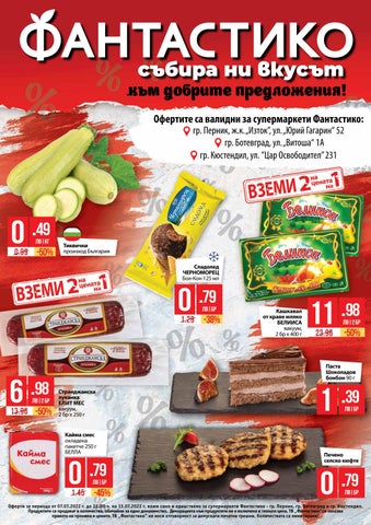 Оферти за периода от 07.07.2022 г. до 22.00 ч. на 13.07.2022 г. важи само и единствено за супермаркети Фантастико - гр. Перник, гр. Ботевград и гр. Кюстендил. Продуктите се продават в количества, обичайни за едно домакинство. Декорацията към продуктите не е включена в тяхната цена. ТВ „Фантастико“си запазва правото на промяна в цените. ТВ „Фантастико” не носи отговорност за допуснати печатни грешки. Количествата са лимитирани!