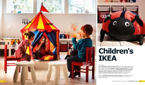 Children's IKEA L E F T PAG E: new CIRKUSTÄLT children's tent £14.99 Easy to move or take down when not in use. Recommended for age 18 months+. Polyester tent with polyurethane floor. Ø100, H120cm. 302.068.82 MAMMUT children's stools £4.99/ea Polypropylene plastic. Ø30, H30cm. White. 901.766.41 KRITTER children's chairs £9.99/ea Solid rubberwood with polystyrene plastic. 27×29, H53cm. Red. 801.536.97 TROFAST storage combination with boxes £52.50 Foil finish and plastic. Designer: Studio Copenhagen. 99×44, H56cm. White/red. 198.968.62 A B OV E: SAGOSTEN air element with cover £23.99 Recommended for age 3+. Textile and plastic. Designers: Jan Dranger/Lena Håkanson. Ø71, H30cm. Ladybird. 498.728.50