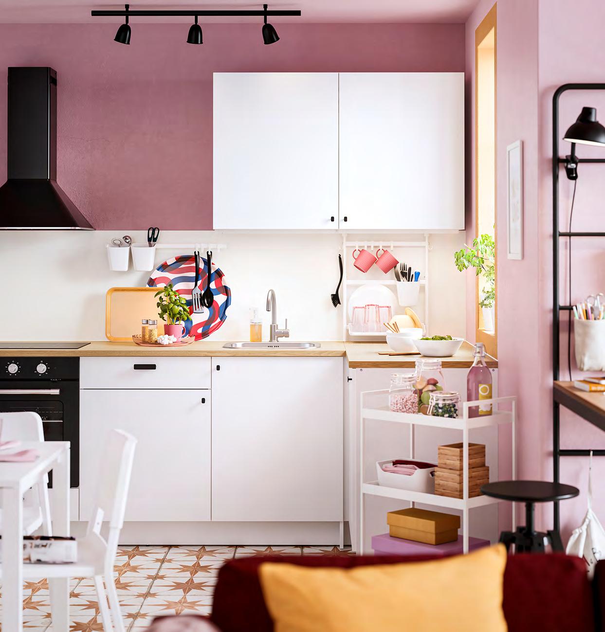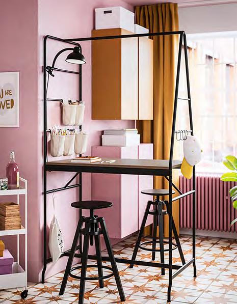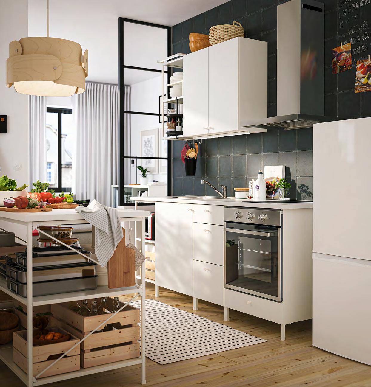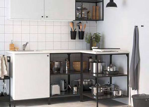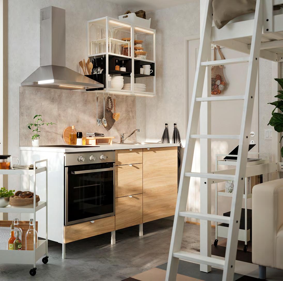 54 ENHET ENHET 55 Задайте стила Изложете любимите си неща на показ и използвайте шкафовете, за да държите останалите си вещи далече от погледа. Въртящият се органайзер, поставен в открита стенна етажерка, дава лесен достъп до предметите, които се ползват всеки ден, и е идеален за по малки бутилки и буркани 1 ENHET кухненски остров/етажерка. Тази комбинация предлага просторни открити модули за съхранение на по-големи съдове като тенджери, тигани и кошници за хляб Можете също да го използвате, за да приготвяте или сервирате храна или да поставите голяма купа с плодове Прахово боядисана стомана Ш123×Д63.5, В91см Бяло 693.315.16 2 ENHET кука/2 бр. в к т. За закачване в отворите под открита рамка ENHET или върху релса за куки ENHET, която се продава отделно. Прахово боядисана стомана Д5см Бяло. 004.657.54 3 ENHET въртящ се органайзер. Може да се прикрепя лесно към която и да е от откритите или високите етажерки от серията ENHET. Пасва на всички отворени елементи/мебели от серията ENHET. Прахово боядисана стомана Ø21, В40см Антрацит 204.657.34 4 ENHET висящ вътрешен рафт. Просто го закачете върху откритата етажерка - между рафтовете или под стенната етажерка Не се налага да използвате инструменти или да пробивате дупки в стената. Подходящо за високи и стенни етажерки от серията ENHET с дълбочина 30см. Прахово боядисана стомана Ш26×Д28, В15см. Антрацит 704.657.55 Размерите са приблизителни Схемата е с илюстративна цел 280 см ENHET кухня Цената включва шкафове открити етажерки врати чела за чекмеджета, плот крака дръжки мивка смесител и сифон аксесоари ENHET и SKATTÅN. Осветлението и електроуредите се продават Зотделноаповече информация за нашите услуги вижте стр. 66. 123 см Кухненският остров предлага допълнително място за съхранение и е идеално място за приготвяне на храна или за приятни разговори с вашите приятели ENHET въртящ се органайзер 3 ENHET кухненски остров 1 4 ENHET висящ вътрешен рафт 2