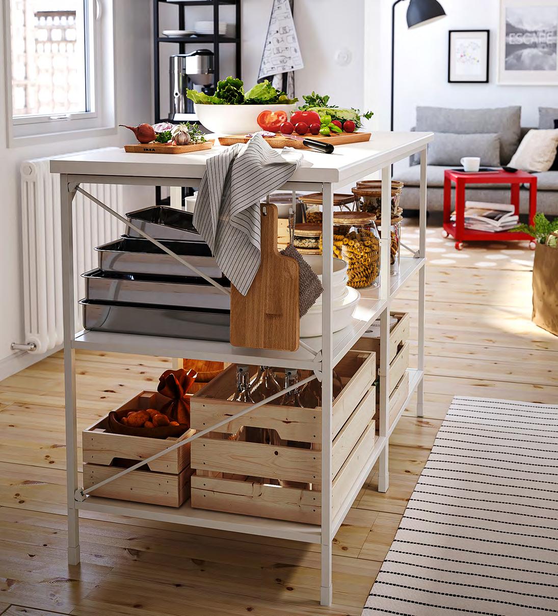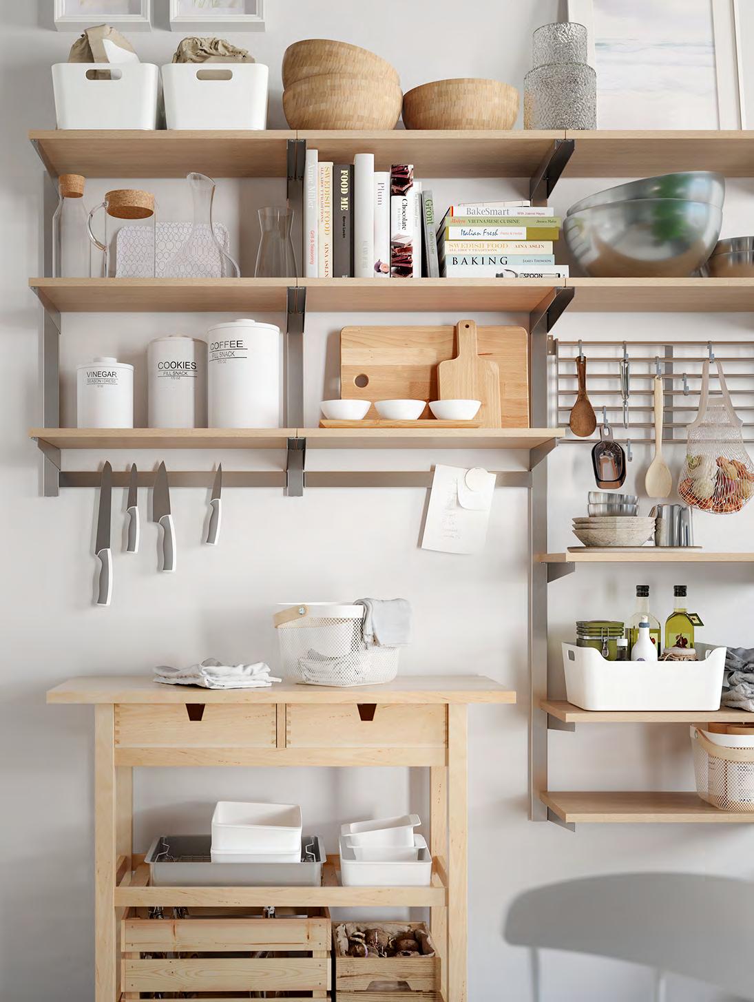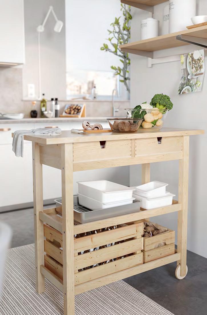 и с други продукти от серията VARIERA. Пластмаса Ш33.5×Д24, В14.5см. Бяло 701.772.55 5 FÖRHÖJA кухненска количка. Осигурява допълнително пространство за съхранение в кухнята Масив бреза. Д100×Ш43, В90см. 800.359.20 Винаги с широк кръгозор Придайте на вашето пространство нотка на истинска професионална кухня. Създайте си лесен достъп до найчесто използваните от вас прибори със стенните органайзери KUNGSFORS. С количката FÖRHÖJA ще имате допълнително място, за да приготвяте храната, а и може да я избутвате там, където ще ви бъде нужна в момента. FÖRHÖJA кухненска количка 5 KUNGSFORS релса за окачване с рафт/ магнитна лента за ножове 2 RISATORP кошница 3 4 1