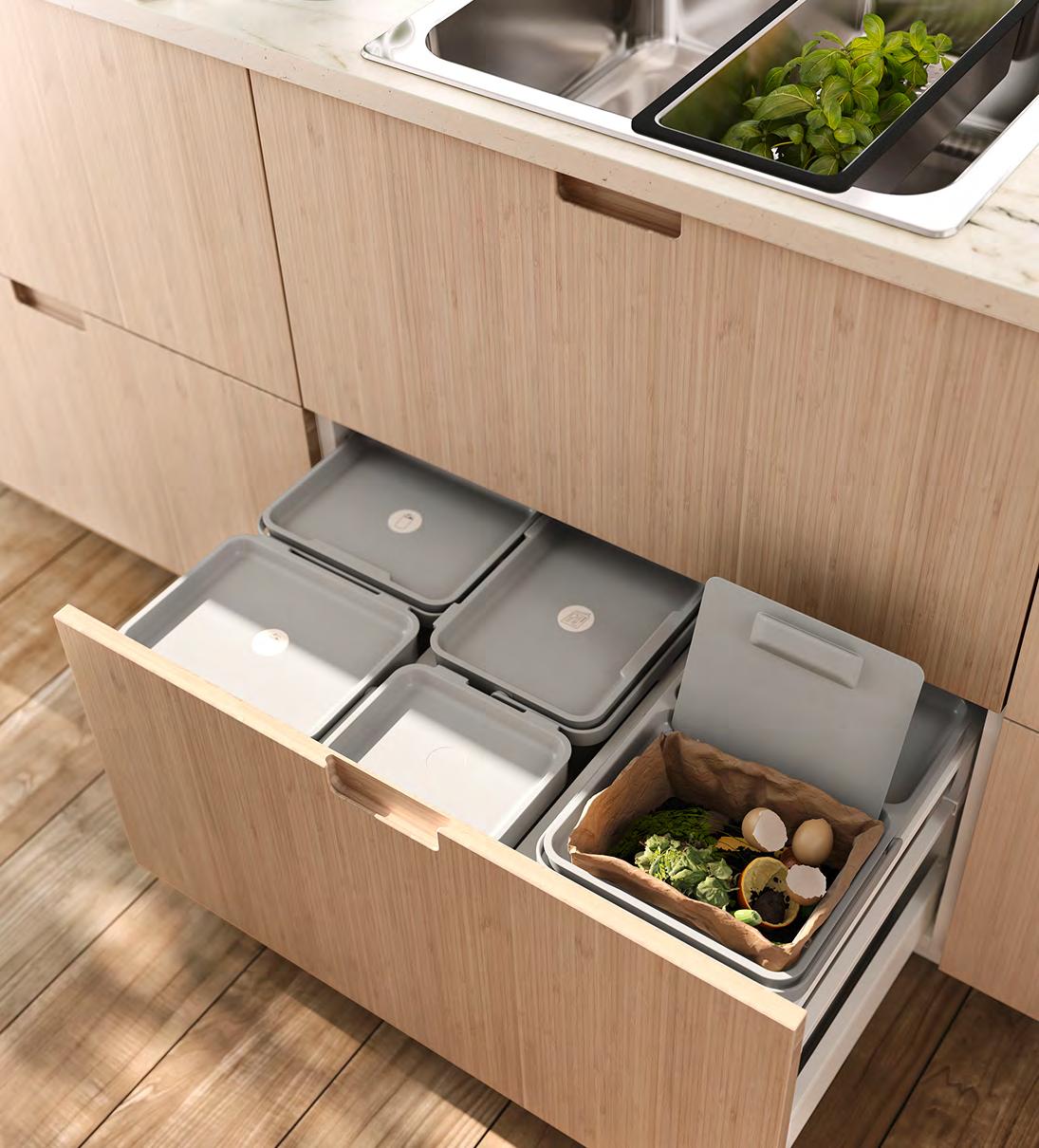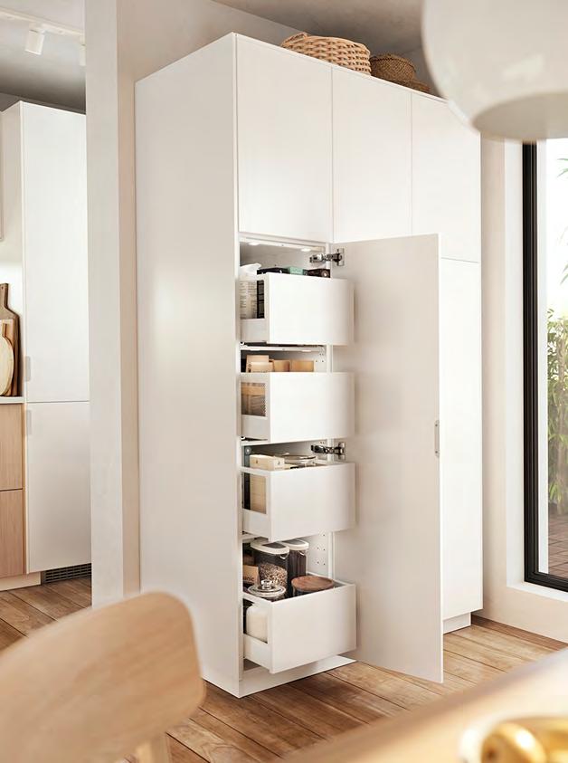 Намалете, използвайте отново и рециклирайте Дайте вашия принос към по-устойчивия начин на живот, използвайки цялата храна, която купувате – плъзгащите се гладко чекмеджета MAXIMERA се изтеглят докрай, за да предложат пълен поглед върху съдържанието вътре, и се затварят безшумно. А и да не забравите нещо в дъното на хладилника! Кръглата поставка SNURRAD се изтегля и завърта – така виждате и достигате дори и най-малкото бурканче MAXIMERA чекмедже, високо 2 HÅLLBAR решение за сортиране на отпадъци 3 1 SNURRAD кръгла поставка Когато сте приключили с готвенето, можете да сортирате различните материали в кошовете HÅLLBAR – просто действие и първа стъпка към това да дадете на отпадъците нов живот 1 SNURRAD кръгла поставка. Издърпва се и се завърта на 360°, давайки лесен достъп до необходимите ви неща Пластмаса SAN. Ш42×Д28см. Прозрачно 905.061.04 2 MAXIMERA чекмедже високо Чекмеджето е с вграден механизъм за плавно, леко и безшумно затваряне Може да се допълни с преграда MAXIMERA, за да поддържате предметите си подредени без да се хлъзгат Прахово боядисана стомана и меламиново фолио Ш36.4×Д54.2см. Бяло 002.046.34 Челото се продава отделно 3 HÅLLBAR решение за сортиране на отпадъци Комбинация от пет коша за сортиране на всичко – от кенчета и малки опаковки до крушки и батерии както и един кош за сортиране на сухи и мокри органични отпадъци Монтирайте във високо чекмедже MAXIMERA 80x60см или във високо чекмедже MAXIMERA 80x45см, за да осигурите място за тръби зад чекмеджето. Прахово боядисана стомана и полипропиленова пластмаса Ш74.7×Д43.2см. Светлосиво. 093.096.98 44 METOD/ FRÖJERED/VEDDINGE METOD/ FRÖJERED/VEDDINGE 45
