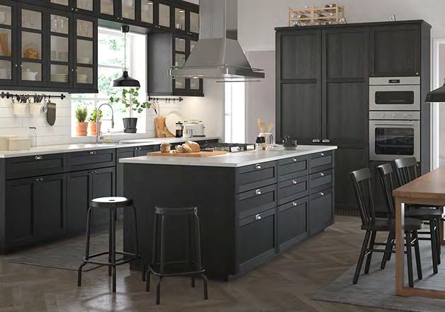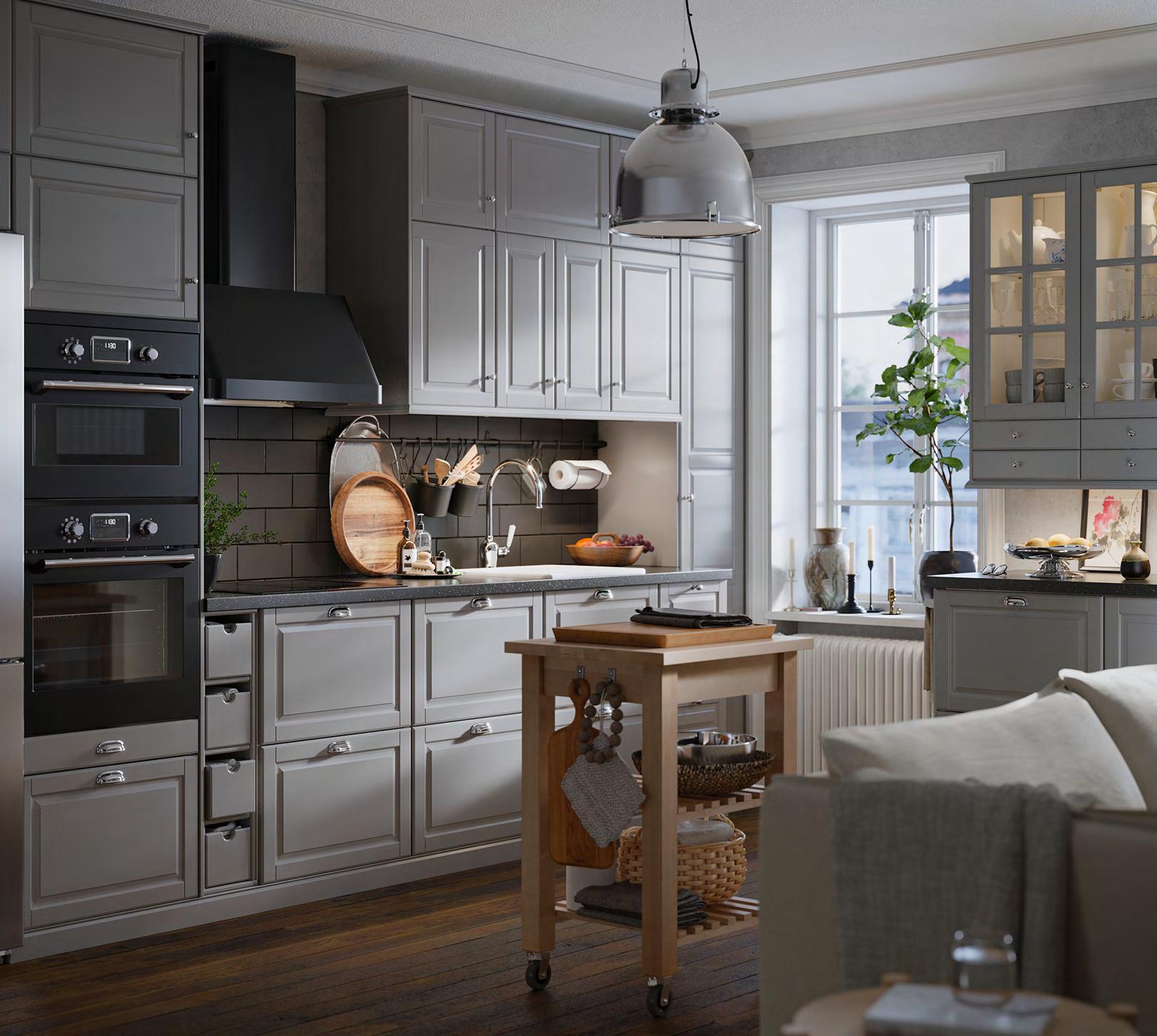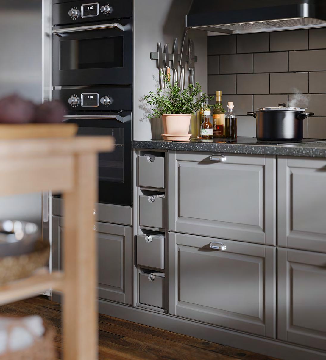 36 METOD/BODBYN METOD/BODBYN 37 Размерите са приблизителни. Схемата е с илюстративна цел. см021 400 см METOD/BODBYN кухня Какво включва цената на кухнята вижте на стр. 64-65. За повече информация за нашите услуги вижте стр. 66. Изчистена елегантност Използвайте гъвкавата кухненска система METOD, за да си създадете ваш личен уютен оазис, дори и мъничък. Комбинацията на фрезованите чела BODBYN и стъклени врати ще създаде усещане за къща в провинцията. Кухня METOD със сиви врати, чела за чекмеждета стъклени врати BODBYN чекмеджета с плавно затваряне MAXIMERA, открити шкафове и кутии TORNVIKEN Шкафове METOD с бяло меламиново фолио Врати/ чела за чекмеджета BODBYN с покритие боя и стъклени врати от закалено стъкло Чекмеджета MAXIMERA, прахово боядисана стомана и меламиново фолио Открити шкафове и кутии TORNVIKEN с покритие боя Стилно допълнени с продълговати и обли дръжки ENERYDA от хромиран алуминий и плот SÄLJAN черно цвят минерал ламинат. 1 SMAKSAK фурна с горещ въздух Клас енергийна ефективност: A+ (от D до A+++) Волтаж: 220-240V Ш59.4×Д56 7, В58 9см. Черно 904.117 28 2 BEKVÄM кухненска количка. Осигурява допълнително място за съхранение и работа. Масив бреза. Д58×Ш50 В85см. Бреза. 302.403.48 BEKVÄM кухненска количка 2 1 SMAKSAK фурна с горещ въздух