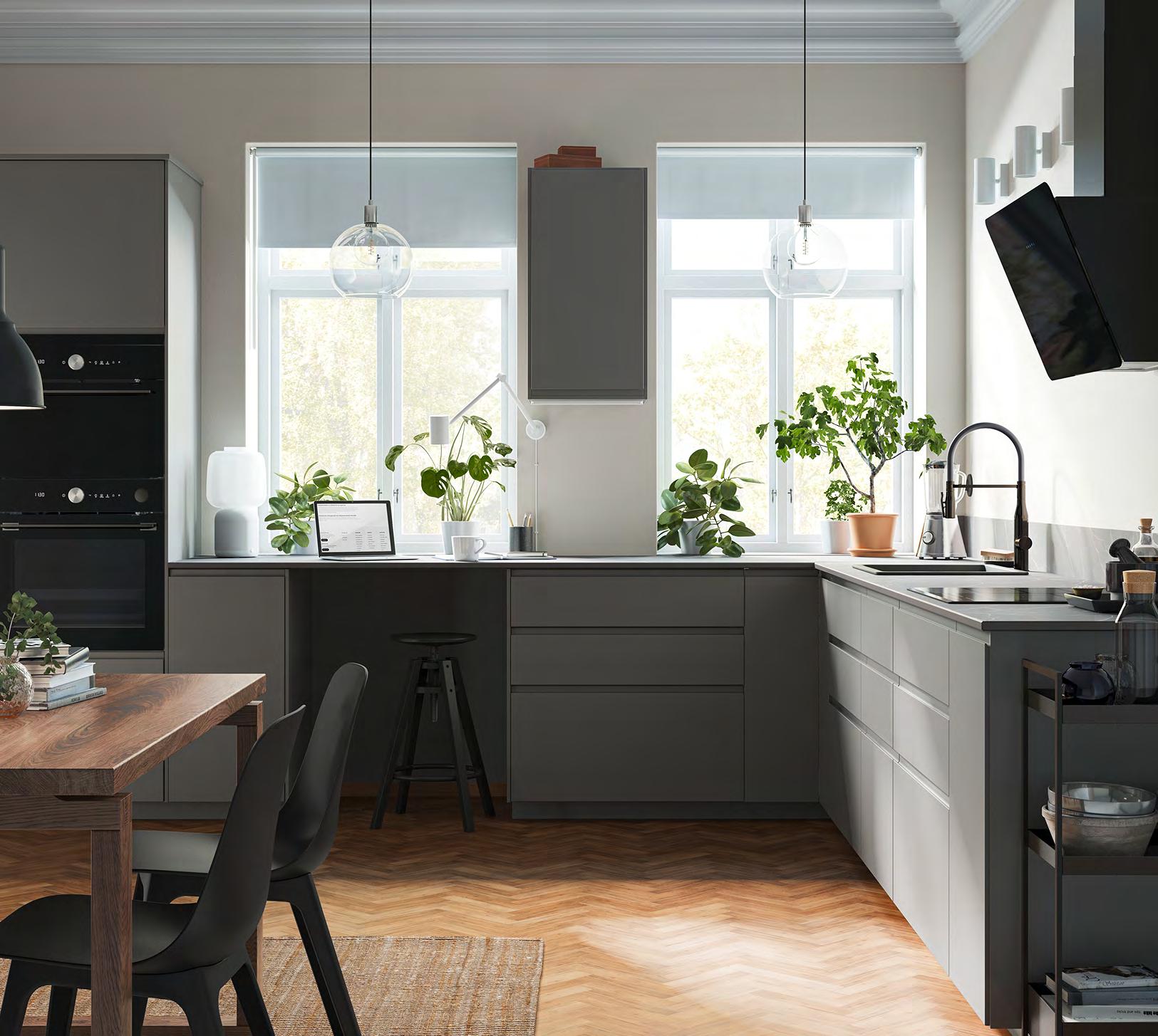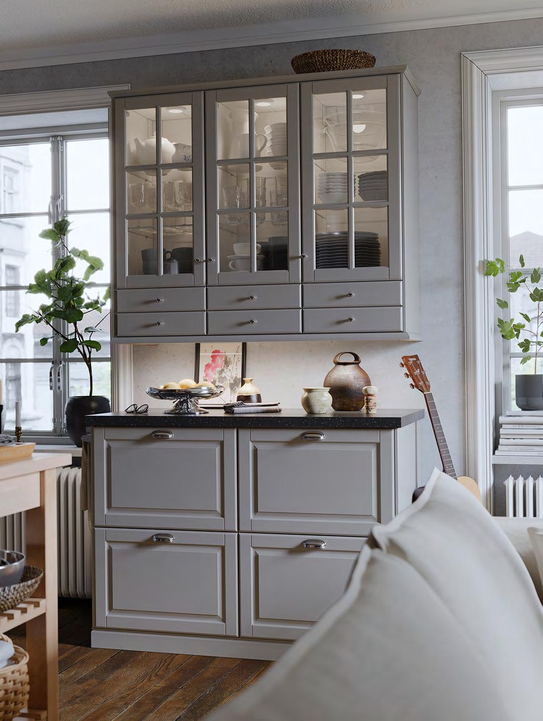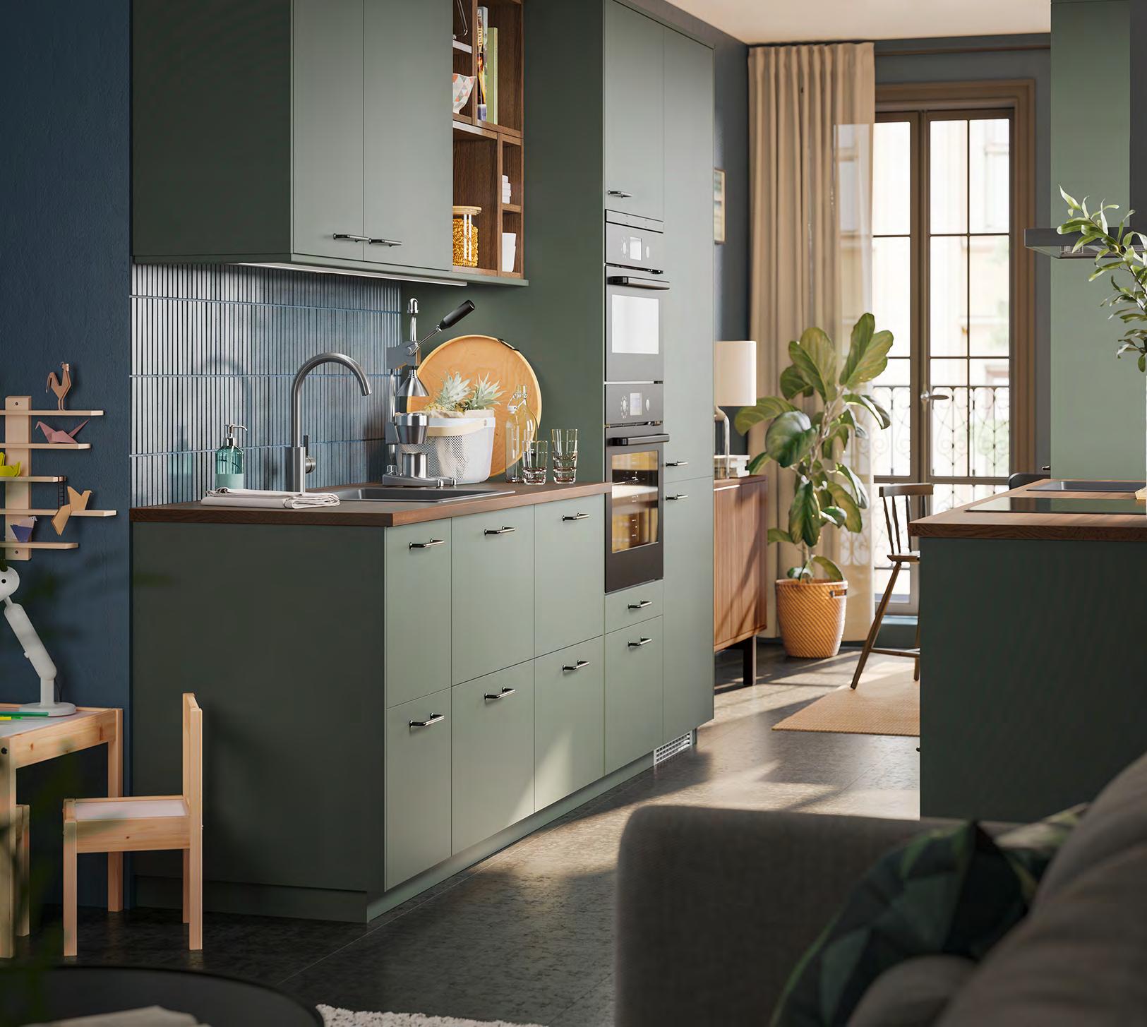 20 METOD/BODARP METOD/BODARP 21 Размерите са приблизителни. Схемата е с илюстративна цел. 280 см 280 см METOD/BODARP кухня Какво включва цената на кухнята вижте на стр. 64-65. За повече информация за нашите услуги вижте стр. 66. Заредете с енергия Смяната на една дейност с друга – това е просто един обикновен ден за вас. Мултифункционалната кухня ще ви подпомага в стремежа ви да водите пълноценен живот дори когато графикът стане натоварен – от готвенето и храненето до моментите, когато си почивате, заобиколени от близките си хора. Сивозелените чела и врати BODARP върху шкафовете придават хомогенен облик с модерна нотка. Кухня METOD със сивозелени врати и чела за чекмеджета BODARP, чекмеджета с плавно затваряне MAXIMERA, решение за открито съхранение и етажерки за вино VADHOLMA Шкафове METOD с бяло меламиново фолио. Врати/чела за чекмеджета BODARP с покритие фолио и рециклирано фолио. Чекмеджета MAX MERA, прахово боядисана стомана и меламиново фолио. Решение за открито съхранение и етажерки за вино VADHOLMA с фурнир ясен байц с безцветен лак и покритие фолио. Стилно допълнени с черни дръжки BAGGANÄS, прахово боядисана стомана и плот EKBACKEN, кафяво цвят орех, ламинат. 1 DELSJÖN кухненски смесител. С аератор (8 л/ мин), който спестява вода и електричество на системи с високо налягане. Метализиран месинг и цинк и полиамидна пластмаса. В36см. Тъмен калай 604.887.81 2 EFTERSMAK фурна с горещ въздух Клас енергийна ефективност: А+ Волтаж: 220-240V Комплектът включва: 1 бр. метална етажерка, 1 бр. форма за печене с грил функция Ш59 4×Д56 7, В58.9см. Черно. 704.117 29 2 EFTERSMAK фурна с горещ въздух 1 DELSJÖN кухненски смесител Проектиране Дори и за големите проекти, малките неща са от значение. Обсъдете идеите си с нареализиратеиинтериореннашконсултантщевипомогнемдавсичкодой-малкиядетайл.