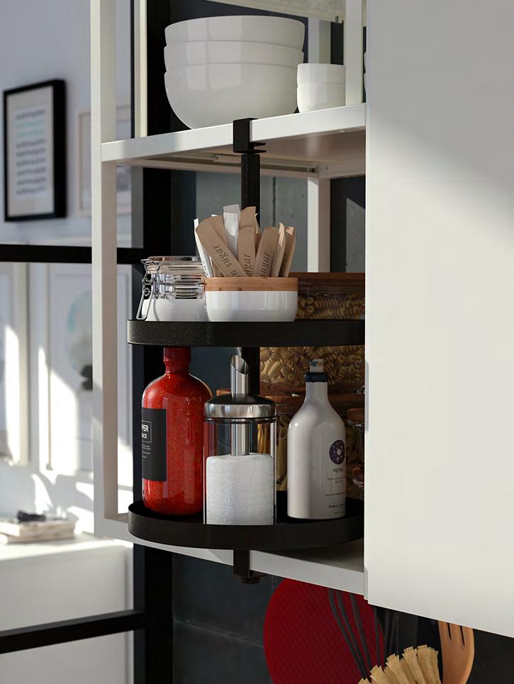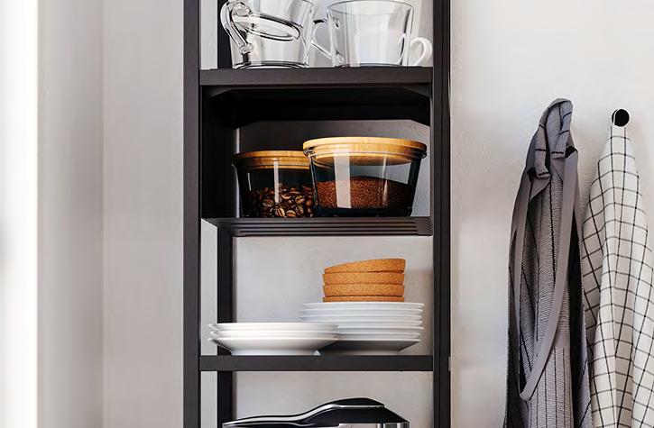 1 SÄLJAN плот. Високопресован меламинов ламинат. Дължина 246см. Дълбочина 63 5см. Дебелина 3 8см Черно/цвят минерал/ламинат. 702 022 12 2 HULTARP кукичка/5 бр. в к т Артикулът може да се комбинира с други аксесоари от серията HULTARP Прахово боядисана стомана. В7см Черно. 104.444.45 3 HULTARP контейнер. Прахово боядисана стомана и пластмаса. Ш14×Д16, В12см. Черно. 304.444.54 4 TORNVIKEN кутия Оразмерено за открит шкаф TORNVIKEN Кутията може да бъде издърпана от шкафа така имате лесен достъп до съдържанието ѝ. С покритие боя Ш16×Д34 В15см Сиво. 003 589 66 Кухнята на вашите мечти е на една ръка разстояние Заявете стила си и организирайте съхранението така, както искате. Плиткият шкаф пасва идеално в тесния ъгъл – по този начин ще използвате всеки сантиметър от кухнята си. Релсата HULTARP с кукички и контейнер и откритият шкаф с чекмеджета TORNVIKEN са практични и грабващи окото добавки към интериора. TORNVIKEN кутия 4 3 HULTARP контейнер 1 SÄLJAN плот 2 38 METOD/BODBYN METOD/BODBYN 39