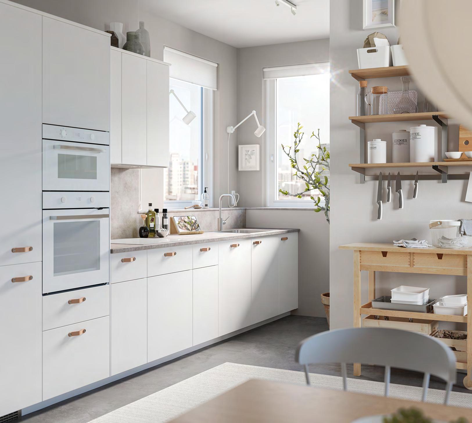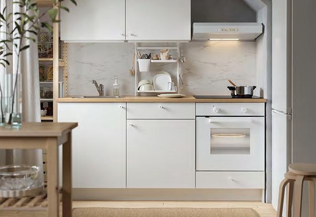 24 METOD/VEDDINGE/KUNGSFORS METOD/VEDDINGE/KUNGSFORS 25 Размерите са приблизителни. Схемата е с илюстративна цел. см180 420 см METOD/VEDDINGE кухня Какво включва цената на кухнята вижте на стр. 64-65. За повече информация за нашите услуги вижте стр. 66. Уют без всякакво усилие Ако ежедневието ви е напрегнато, ще оцените спокойствието, излъчвано от гладките врати VEDDINGE. Съдовете са прибрани в пълен ред в просторните шкафове. Там те остават и далече от погледа, когато сте готови да поднесете храната. Кухня METOD с бели врати, чела за чекмеджета VEDDINGE и чекмеджета с плавно затваряне MAX MERA Шкафове METOD с бяло меламиново фолио Врати/чела за чекмеджета VEDDINGE, боя Чекмеджета MAXIMERAпрахово боядисана стомана и меламиново фолио Стилно допълнени с дръжки ÖSTERNÄS естествена кожа и ламиниран плот EKBACKEN светлосиво цвят бетон. 1 BEJUBLAD микровълнова фурна Изходна мощност, микровълнова 1000W. Волтаж: 220 240V Въртяща се поставка Ø 32 5см. 7 степени на мощност. Електронен дисплей с бели цифри. 1 бр. съд за печене в микровълнова фурна. Включва захранващ кабел. Не е включен щепсел. Ш59 5×Д46.8, В39 7см. Бяло 904.117 47 2 BEJUBLAD фурна с горещ въздух. Клас енергийна ефективност: A+ (от D до A+++) Волтаж: 220-240V Необходим е предпазител (бушон), минимум 13A В комплекта е включена 1 бр. метална етажерка 1 бр. форма за печене и с функция грил. Ш59 5×Д56 9, В59 5см. Бяло/ стъкло. 604.116 64 3 ÄLMAREN кухненски смесител. С аератор 8 л/мин), който спестява вода и електричество на системи с високо налягане. Метализиран месинг В36см. Металически цвят. 004 551.61 ÄLMAREN кухненски смесител 3 BEJUBLAD фурна с горещ въздух 2 1