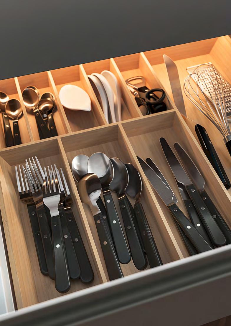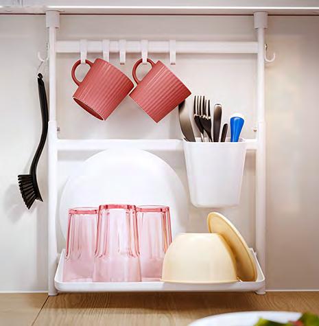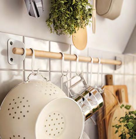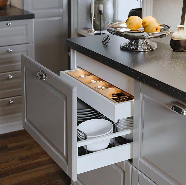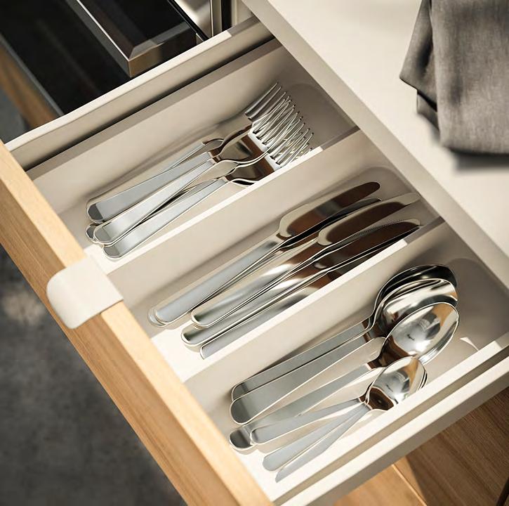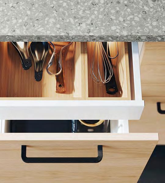 14 METOD/VOXTORP METOD/VOXTORP 15 Създайте вътрешен мир Организирайте, сортирайте, подреждайте и забравете за безпорядъка. Сериите UPPDATERA предлагат голямо разнообразие от вътрешни органайзери, с които да поддържате чекмеджетата си в безупречен вид. 1 UPPDATERA поставка за прибори Оразмерено за чекмеджета с ширина 60 см. За чекмеджета с други размери комбинирайте различни по размер органайзери, за да създадете подходящо решение. Бамбук с покритие от безцветен лак. Ш51.6×Д49.5, В5.6см. Светъл бамбук. 704.331.04 2 UPPDATERA поставка за подправки. Полипропиленова пластмаса Ш16.2×Д48.0, В1.6см. Антрацит. 304.599.78 3 UPPDATERA поставка за ножове. Полипропиленова пластмаса Ш16.8×Д48.0, В4.3см. Антрацит 804.332.07 4 UPPDATERA поставка за чинии Прахово боядисана галванизирана стомана и пластмаса Ш22.4-29 9×В14.5см. Антрацит. 704.861.78 5 UPPDATERA поставка за чинии Прахово боядисана галванизирана стомана и пластмаса Ш26.4-36.9×В14.6см. Антрацит 504.861.79 6 UPPDATERA органайзер за чекмедже. 32 регулируеми колчета улесняват персонализирането на чекмеджетата според съдържанието - напр. чинии, тенджери, капаци или кутии за храна ABS пластмаса и синтетичен каучук. Ш67.5×Д50 В13.2см. Антрацит 004.600.11 Поставката за чинии UPPDATERA предпазва приборите ви от счупени ръбове, така те ще запазят красотата си години наред. А и ще можете да пренасяте до масата всички чинии наведнъж. UPPDATERA поставка за прибори 1 UPPDATERA поставка за чинии 4 2 UPPDATERA поставка за подправки 6 UPPDATERA органайзер за чекмедже 3 5 Регулируемите крачета на органайзера за чекмедже UPPDATERA не позволяват на съдовете ви да се разместват и да създават безпорядък.