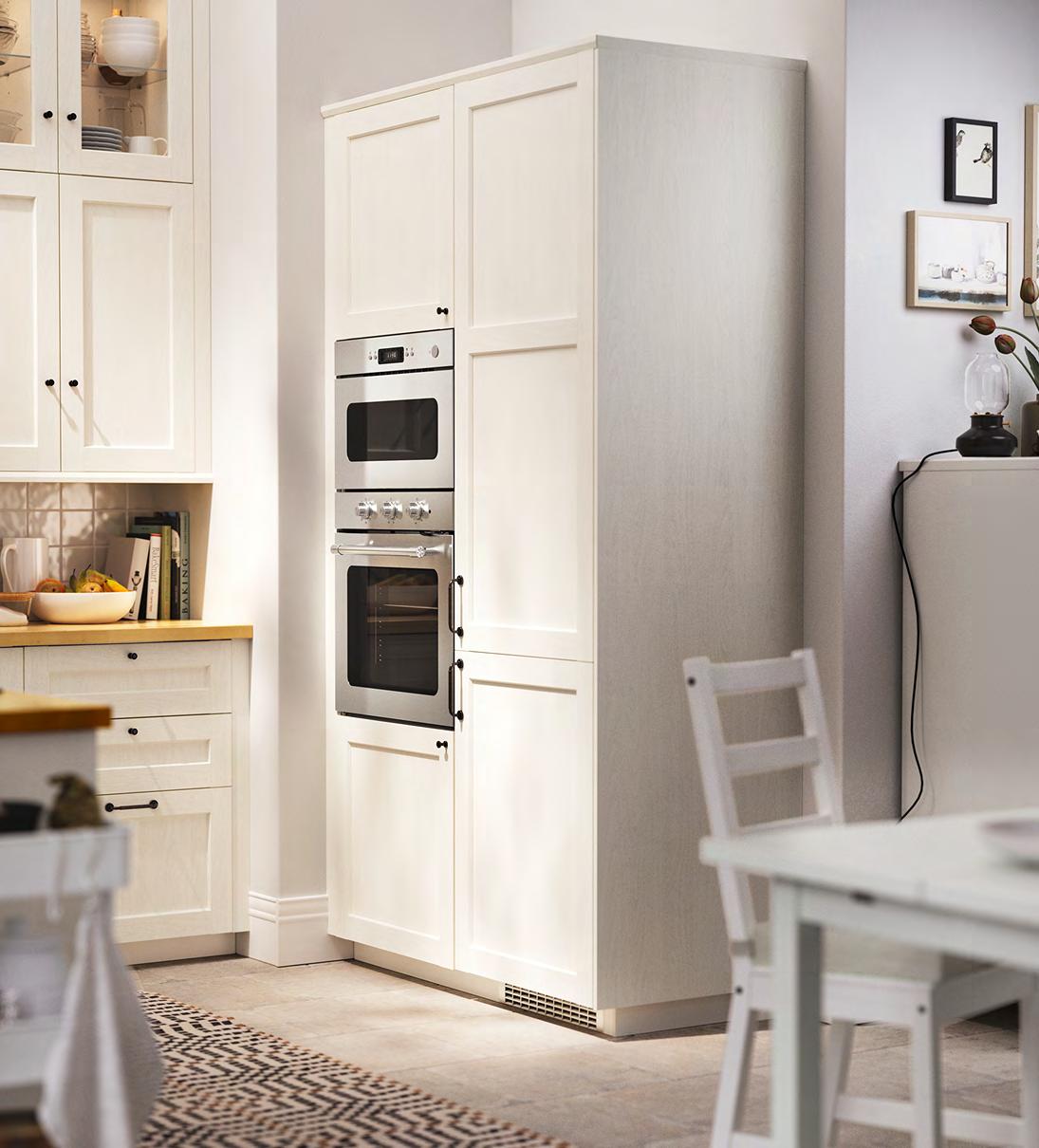 8 METOD/ENKÖPING METOD/ENKÖPING 9 Бъдете организирани и спестете пространство Бъдете готови за закуските набързо и за готварски приключения с челата ENKÖPING, които имат класически облик и повърхност, устойчива на влага и лесна за почистване. Кухня METOD с врати чела за чекмеджета, стъклени врати ENKÖPING бяло цвят дърво и чекмеджета MAXIMERA с механизъм за плавно затваряне. Шкафове METOD с бяло меламиново фолио. Врати/чела за чекмеджета ENKÖPING с покритие фолио и стъклени врати от закалено стъкло. Чекмеджета MAXIMERA, прахово боядисана стомана и меламиново фолио. Стилно допълнени с продълговати и обли дръжки SKRUVSHULT от цинк с безцветен лак цвят антрацит и обли дръжки - цинк безцветен лак - и плот KARLBY с плътен фурнир бреза. 1 MATTRADITION микровълнова фурна Изходна мощност микровълнова 750W. Волтаж: 230V. Въртяща се поставка, Ø 25см. 4 степени на мощност Ш59.5×Д31.7, В39.4см.Неръждаема стомана 603.687.69