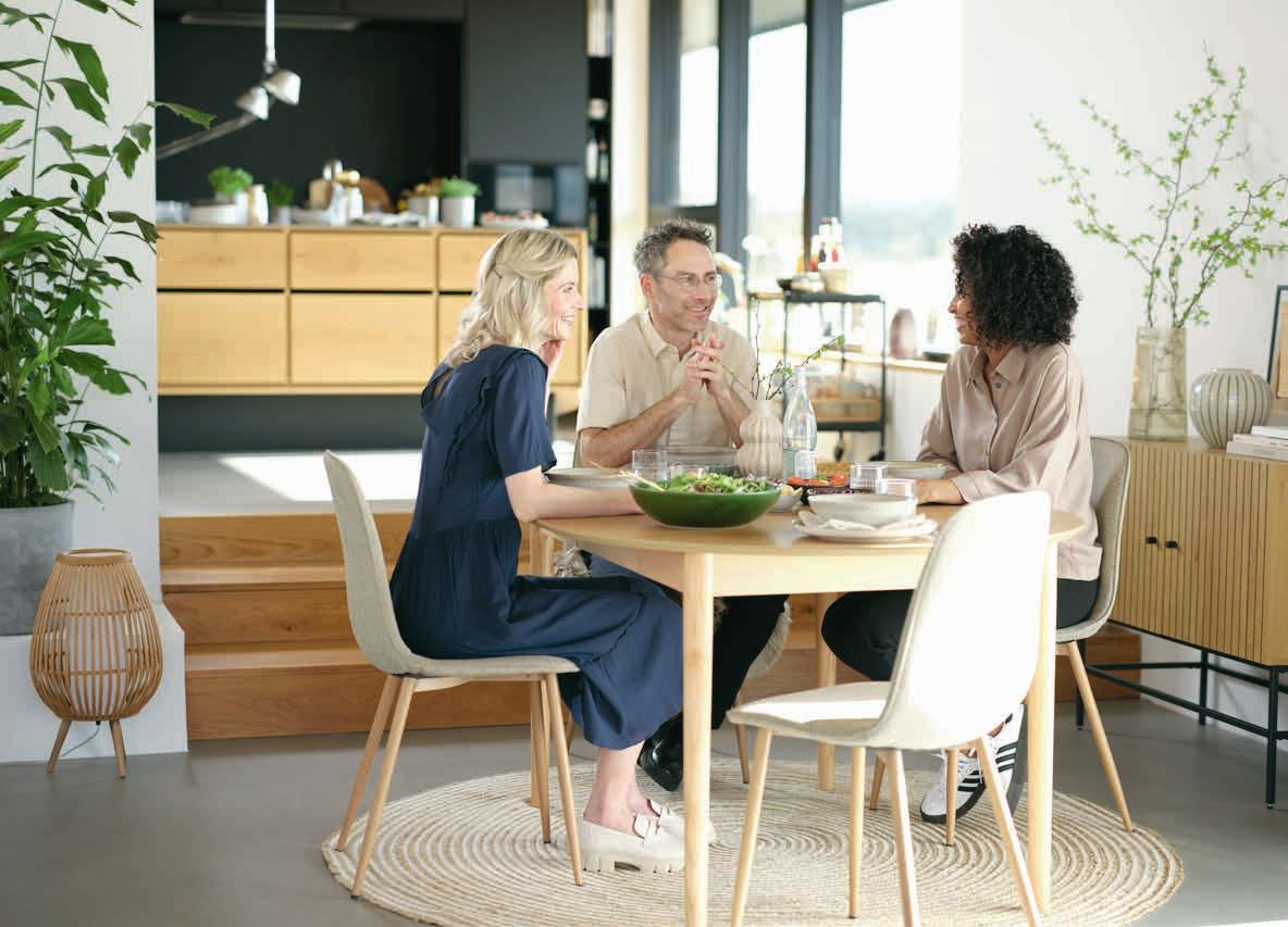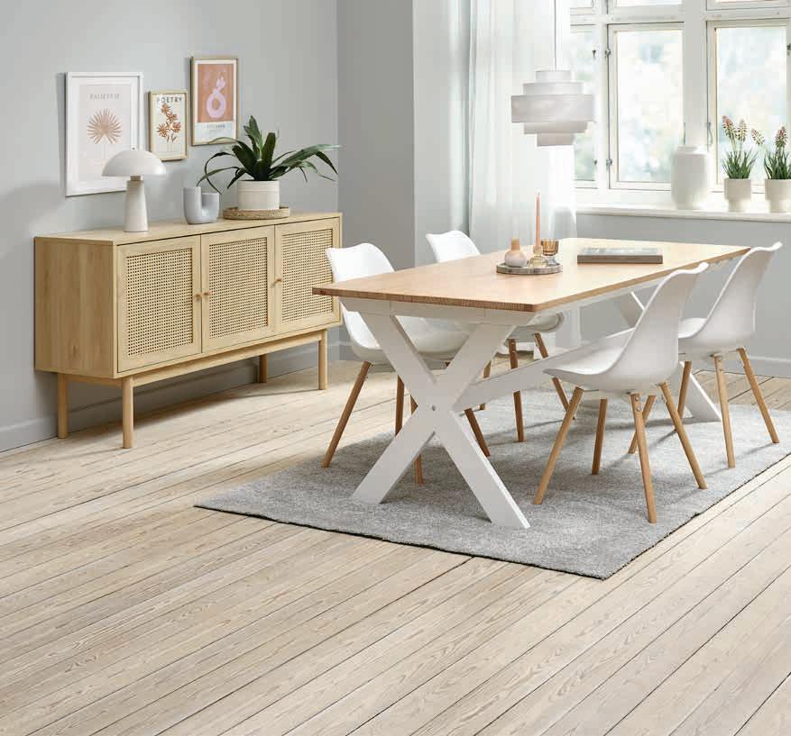 MARSTRAND + BISTRUP КУХНЕНСКИ МЕБЕЛИ Маса: Масивно дърво и дъбов фурнир. Ø110 x В75 см. Вкл. 2 крила. Размер в разгънато състояние Ш110 x Д200 x В75 см. Стол: Текстил и стомана. Маса 1199 лв 550 лв Стол 139 лв 65 лв Спестете 54% 550лв МАСА Спестете 53% 65лв СТОЛ СЕДМИЦА НА СКАНДИНАВСКИЯ СТИЛ