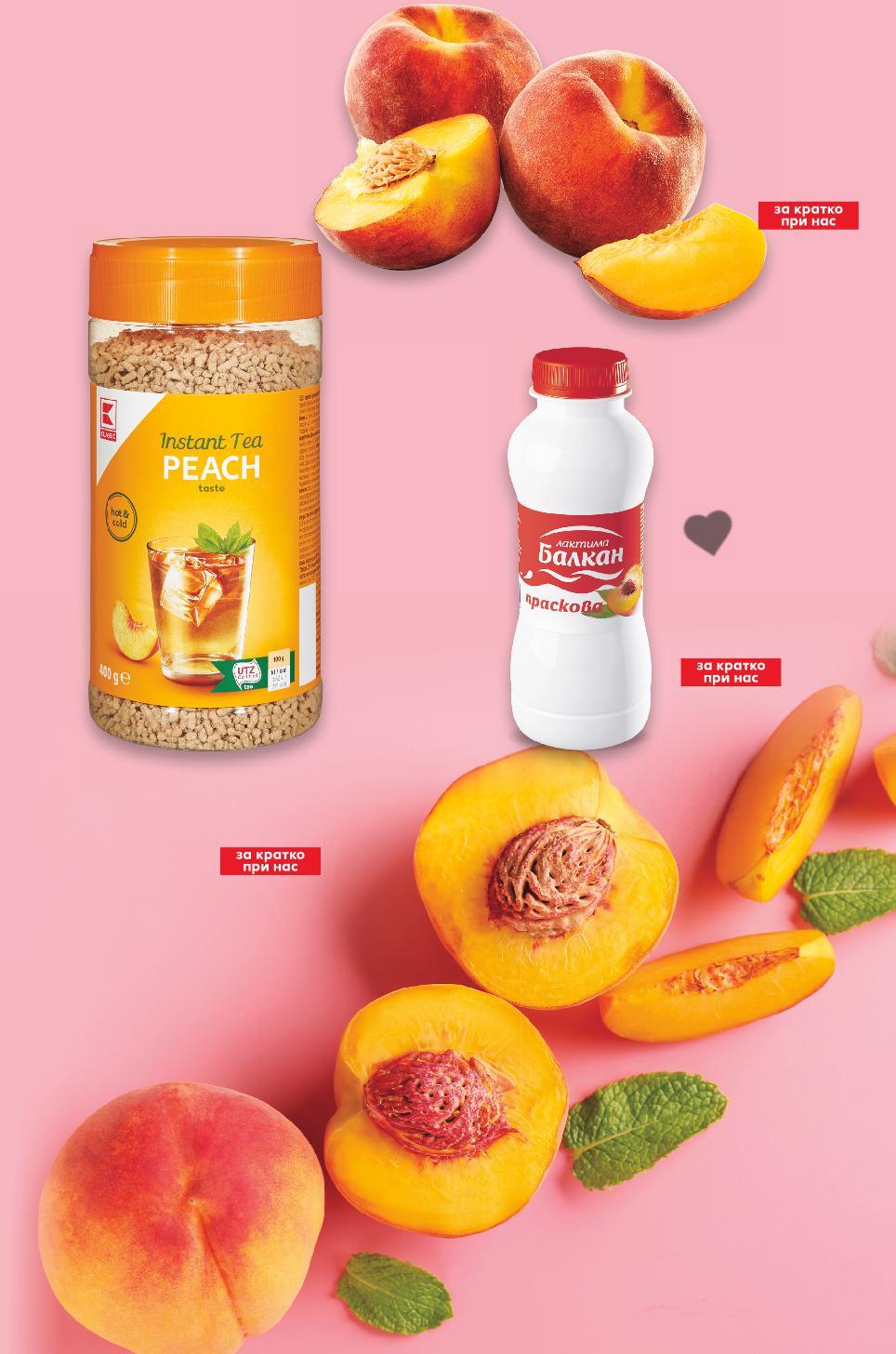Стоките се продават в количества, обичайни за едно домакинство. Всички цени са в лева с включен ДДС. Всички артикули се предлагат без декорация. Снимките са примерни. СЪС СЛАДЪК ВКУС И АРОМАТ НА ПРАСКОВА -29% 1,09 1,55 -22% 3,49 4,49 -29% 2,69 3,79 SAN BENEDETTO Студен чай праскова 0,33 л кен (1 л = 3,31) HAPPY DAY Сок Family Праскова 1 л (1 л = 2,69) КАРНОБАТПЛОД Компот от праскови 700 г (1 кг = 4,99) ПРАСКОВА S10-BG-KW22-CL4-Pano05_OHZ_1_L-1000-10 10