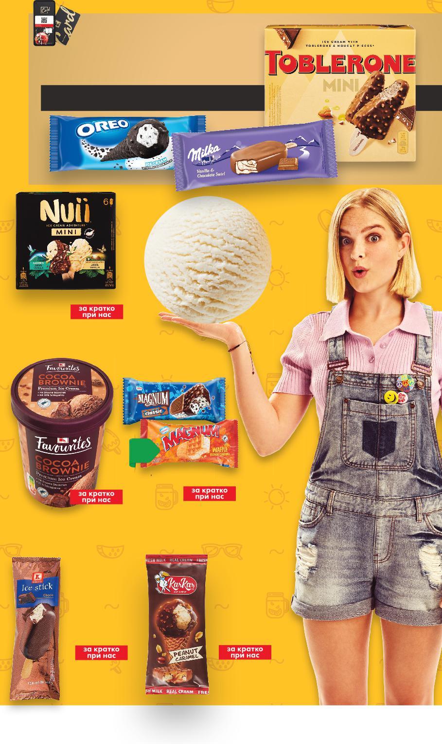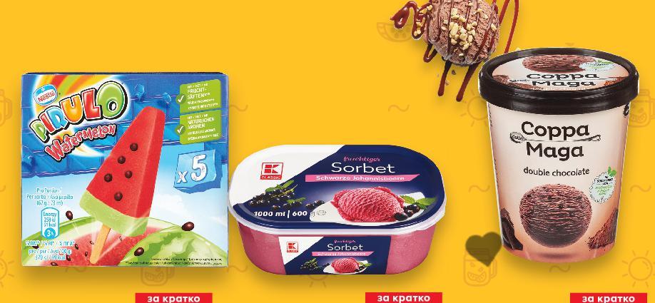 за кратко при нас за кратко при нас при нас ТОПЯЩИ СЕ ЦЕНИ Стоките се продават в количества, обичайни за едно домакинство. Всички цени са в лева с включен ДДС. Всички артикули се предлагат без декорация. Снимките са примерни. -30% 6,99 9,99 -11% 3,99 4,49 -25% 5,99 7,99 -28% 4,99 6,99 -28% 4,99 6,99 -40% 8,99 14,99 -29% 5,99 8,49 4,99 6,99 -28% COPPA DELLA MAGA Сладолед двоен шоколад или ванилия 330 г/ 500 мл (1 кг = 21,19) Сорбе различни вкусове 600 г/ 1 л (1 кг = 6,65) UNCLECHARLY Сладолед различни вкусове 900 мл (1 кг = 6,66) PIRULO Сладолед диня 5 х 73 г (1 кг = 13,68) FAMILIA GRAND Сладолед различни вкусове 1000 мл (1 кг = 9,89) MILKA Сладолед различни