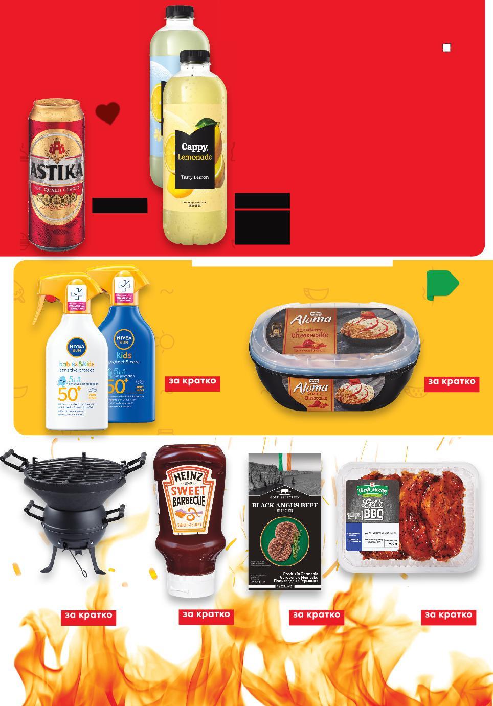 ЛЯТО ИЗГОДНИ ЦЕНИ ASTIKA Бира Fine Quality Lager 3,8% vol 0,5 л кен (1 л = 1,98) ALOMA Сладолед различни вкусове 485 - 500 г / 1000 мл (1 кг = до 16,48) ШЕФ МЕСАР Маринован свински врат (1 кг = 13,32) HEINZ Сос различни видове 400 - 500 г (1 кг = от 11,98) NIVEA SUN Слънцезащитен спрей SPF30 - SPF50 различни видове 200 - 270 мл (1 л = от 88,86) CAPPY Лимонада различни видове 1,25 л PET (1 л = 1,92) BLACK ANGUS Бургер замразен 2 х 125 г (1 кг = 31,96) Ново