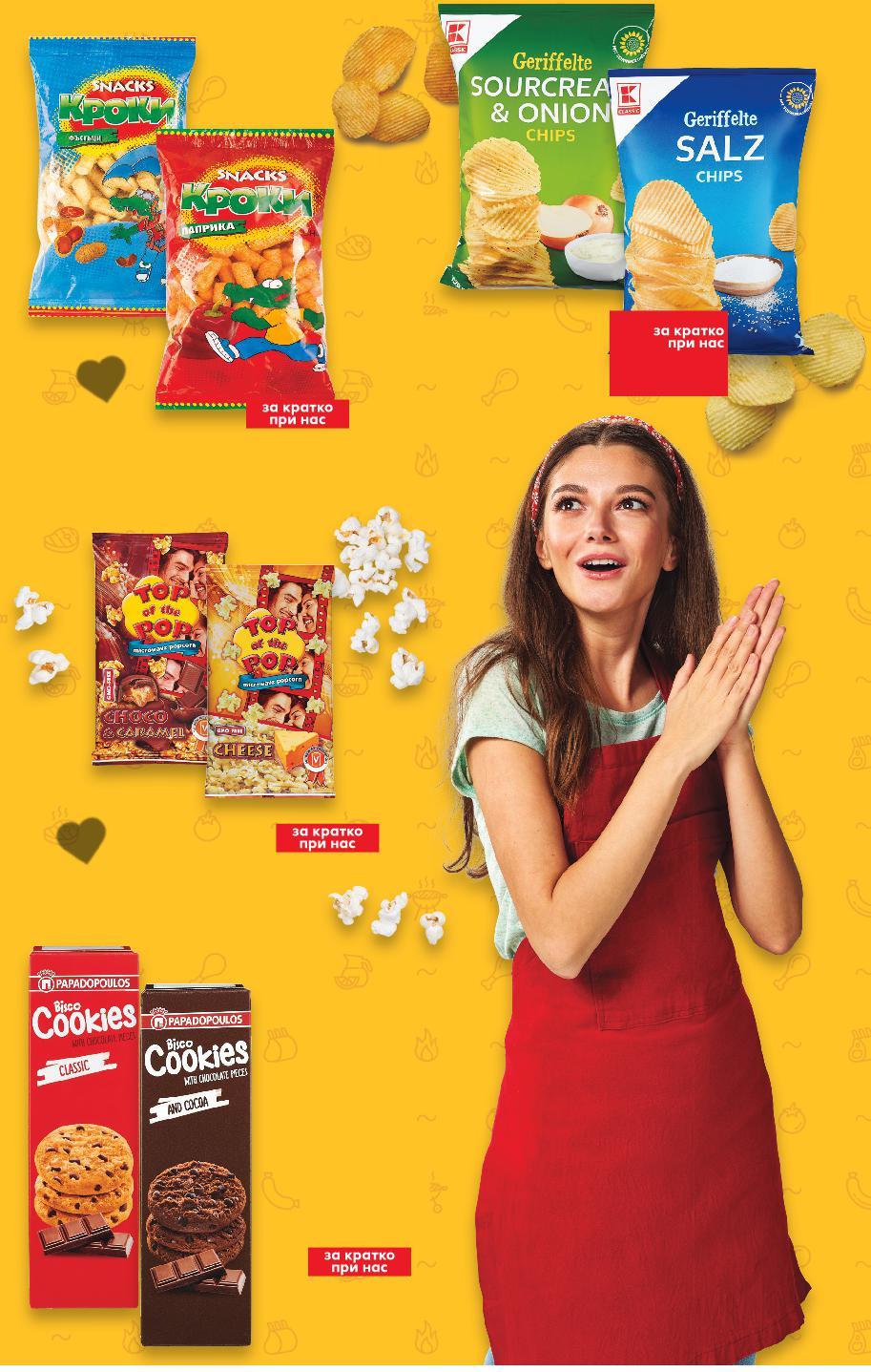 Всички Kaufland Card отстъпки са изчислени спрямо стандартната текуща цена, на която продуктът се предлага в хипермаркета. *Със звездичка са обозначени артикулите, които са специално предложение до изчерпване на наличностите. Kaufland не носи отговорност за печатни грешки. тази седмица -33% 0,99 1,49 -24% 2,79 3,69 -44% 0,49 0,89 2,39 със слънчогледово олио TOP OF THE POP Пуканки за микровълнова различни видове 100 г (1 кг = 9,90) BISCO COOKIES Бисквити различни видове 180 г (1 кг = 15,50) КРОКИ Царевичен снакс избрани видове 50 г (1 кг = 9,80) Къдрав чипс различни вкусове 150 г (1 кг = 15,94) S11-BG-KW18-CL1-Pano3_R-1000-10 11
