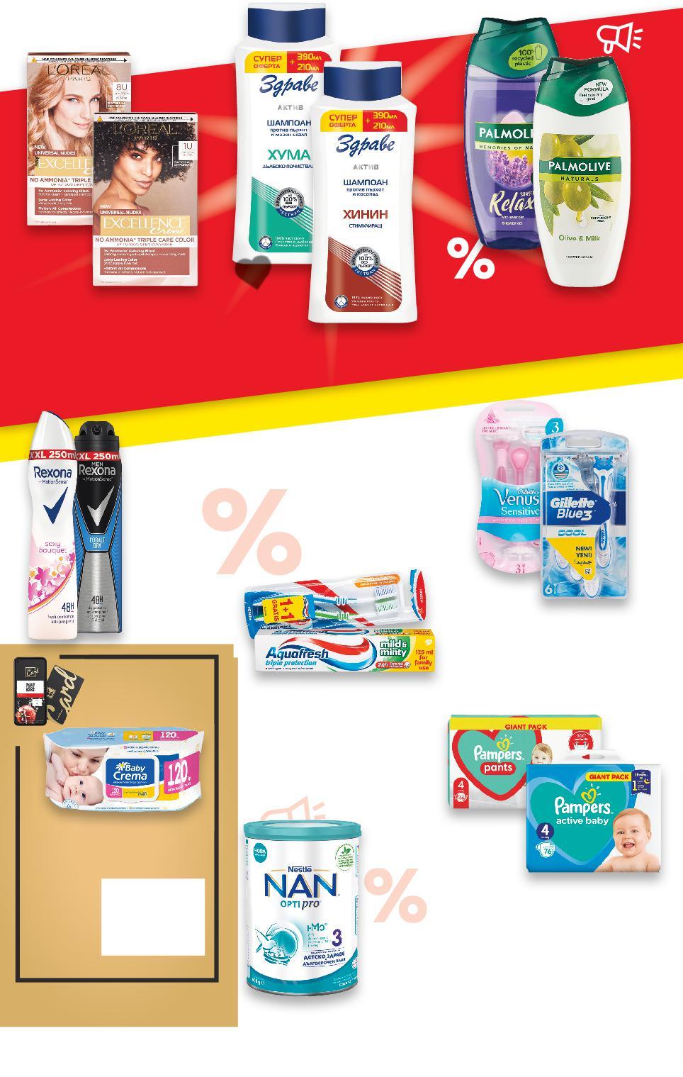 Отстъпката с Kaufland Card e изчислена спрямо стандартната текуща цена, на която продуктът се предлага в хипермаркета. Цените са валидни за посочените на последна страница хипермаркети. Стоките се продават в количества, обичайни за едно домакинство. Всички цени са в лева с включен ДДС. Всички артикули се предлагат без декорация. Снимките са примерни. ПРОДУКТА ДРОГЕРИЯ ЩЕПРИНАМЕРИШНАС НАД 4000 -16% 9,99 11,99 27,99 само 24,99 само -17% 10,99 13,39 1,99 само 5,49 само 5,99* -40% 2,99 само4,99БояNUDESEXCELLENCEL‘OREALзакоса без 1различниамонякцветовебр. гащичкипелениБебешкиPAMPERSили пелени: размери 3, 4, 5, 6 или 7 52 - 90 бр. в гащички:опаковка размери 3, 4, 5 или 6 48 - 76 бр. в опаковка(1бр.=от 0,32) млякораноАдапти-NANNESTLE за 24илинаддеца12надмесеца 800 г (1 кг = 31,24) СамобръсначкаGILLETTE мъжка или дамска Hybrid с 8 или 9 ножчета или Blue3 или Venus3 различни видове 3 - 6 бр. в опаковка (1 бр. = от 1,84)ЧеткаПастаAQUAFRESHилизазъби паста: четка:125видоверазличнимл2бр.(1л=15,92) спрейДезодорантREXONA видоверазлични 250 мл (1 л = 21,96) ДушPALMOLIVEгел различни видове 250 мл (1 л = 11,96) ШампоанАКТИВЗДРАВЕ различни видове 390 + 210 мл (1 л = 9,99) -32% 2,49 3,69амо 3,69самокърпичкивлажниБебешкиCREMABABY с лайка 120 бр. опаковкав Цена CARDKAUFLANDс КОЗМЕТИКА S30-BG-KW34-LFT-DRP_L-1000-10 30