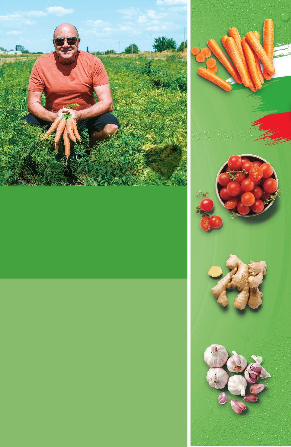 Цените са валидни за посочените на последна страница хипермаркети. Стоките се продават в количества, обичайни за едно домакинство. Всички цени са в лева с включен ДДС. Всички артикули се предлагат без декорация. Снимките са примерни. В част от нашите хипермаркети морковите ще бъдат и от други доставчици. Виж повече на dogovorno-izkupuvanekaufland.bg/ С екипа на Грийнс Трейд ООД си партнираме за ДОГОВОРНО ИЗКУПУВАНЕ НА ПРОДУКЦИЯТА. Йордан Балабанов от Грийнс Трейд ООД отглежда вкусни български моркови близо до град Първомай. ДОГО В ОРНОИЗКУПУВАНЕНАПРОД У К ЦИЯТА ✓ КЛИЕНТЪТ Е СПОКОЕН, че продуктите са чисти и от местни производители. ✓ ПРОИЗВОДИТЕЛЯТ Е СИГУРЕН къде ще пласира продукцията си ✓ KAUFLAND ГАРАНТИРА качеството на отглежданите продукти 5,99 само 6,99 само 0,95 само 3,49 само Джинджифил ароматсКлас:корениIотличителенимеквкус кг Сух чесън Клас: I кг (1 кг = 6,99) Моркови Клас: I кг Чери домати Клас: I кг ПЛОДОВЕ И ЗЕЛЕНЧУЦИ от района на гр. Първомай S8-BG-KW34-LFT-OGP_L-1000-10 8