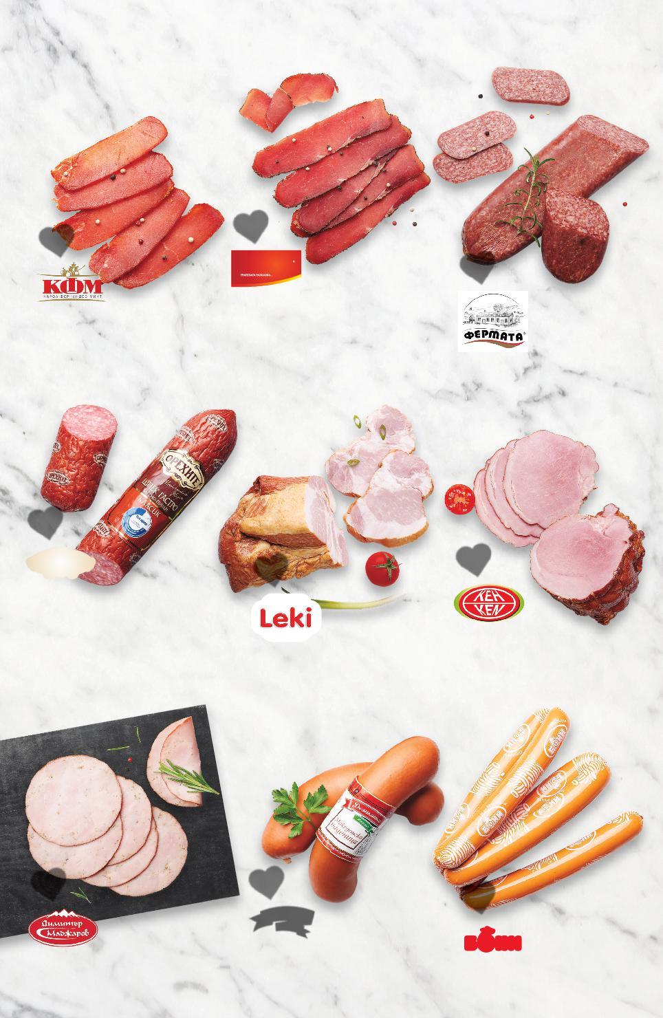 МЕСО ОТ ВИТРИНА С ОБСЛУЖВАНЕ Цените са валидни за посочените на последна страница хипермаркети. Стоките се продават в количества, обичайни за едно домакинство. Всички цени са в лева с включен ДДС. Всички артикули се предлагат без декорация. Снимките са примерни. Цените са валидни за посочените на последна страница хипермаркети Стоките се продават в количества, обичайни за едно домакинство 5,99 само 6,99 само 9,99 само крилаПилешки охладени кг (1 кг = 5,99) гърдиСвински с варено-пушеникост кг (1 кг = 6,99) обезкостенПилешки бут без охладенкожа кг (1 кг = 9,99) КОНСУЛТАЦИЯ ОТ НАШИТЕ ЛЮБЕЗНИ КОЛЕГИ ПРЕСНИ ДОСТАВКИ ДЕН СЛЕД ДЕН СВЕЖЕСТ ОТ ВИТРИНАТА С ОБСЛУЖВАНЕ ОТЛИЧНО КАЧЕСТВО И 100% ПРЯСНО МЕСО ОТ НАШАТА ВИТРИНА С ОБСЛУЖВАНЕ S10-BG-KW34-LFT-BED1_L-1000-10 10