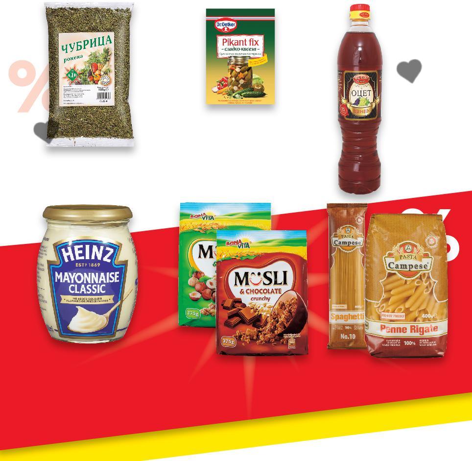 Отстъпката с Kaufland Card e изчислена спрямо стандартната текуща цена, на която продуктът се предлага в хипермаркета. *Със звездичка са обозначени артикулите, които са специално предложение до изчерпване на наличностите. Kaufland не носи отговорност за печатни грешки. Отстъпката с Kaufland Card e изчислена спрямо ОСНОВНИ ХРАНИ -15% 1,39 1,65 -17% 1,39 1,69 -10% 1,79 1,99 -34% 2,89 4,39 -20% 4,99 6,29 -16% 0,99 1,19 -41% 1,39 2,39 -30% 4,19 5,99само само -20% 3,95 с4,99 4,99 амо само ВиненVEDA оцет 6% 700 мл (1 л = 1,99) БрашноМЕЛСОФИЯ екстра 1 кг (1 кг = 1,39) изделияМакаронениCAMPESE различни видове 400 - 500 г (1 кг = до 4,48) BONA МюслиVITAкрънч шоколад или лешник 375 г (1 кг = 7,71) МайонезаHEINZ класик или лека 480 мл (1 л = 10,40) DR. туршииСмесOETKERза Pikant сладко-киселаfix или букет подправки 100 г (1 кг = 9,90) ЧубрицаАДИ ронена 100 г (1 кг = 13,90) 1българскиБобKRINAкг(1кг=4,19) VITAE D‘ORO 1слънчогледовоОлиол(1л=3,95) Цена CARDKAUFLANDс Цена CARDKAUFLANDс ДО 4 БРОЯ НА ПОКУПКА S21-BG-KW34-LFT-NMP1_R-1000-10 21