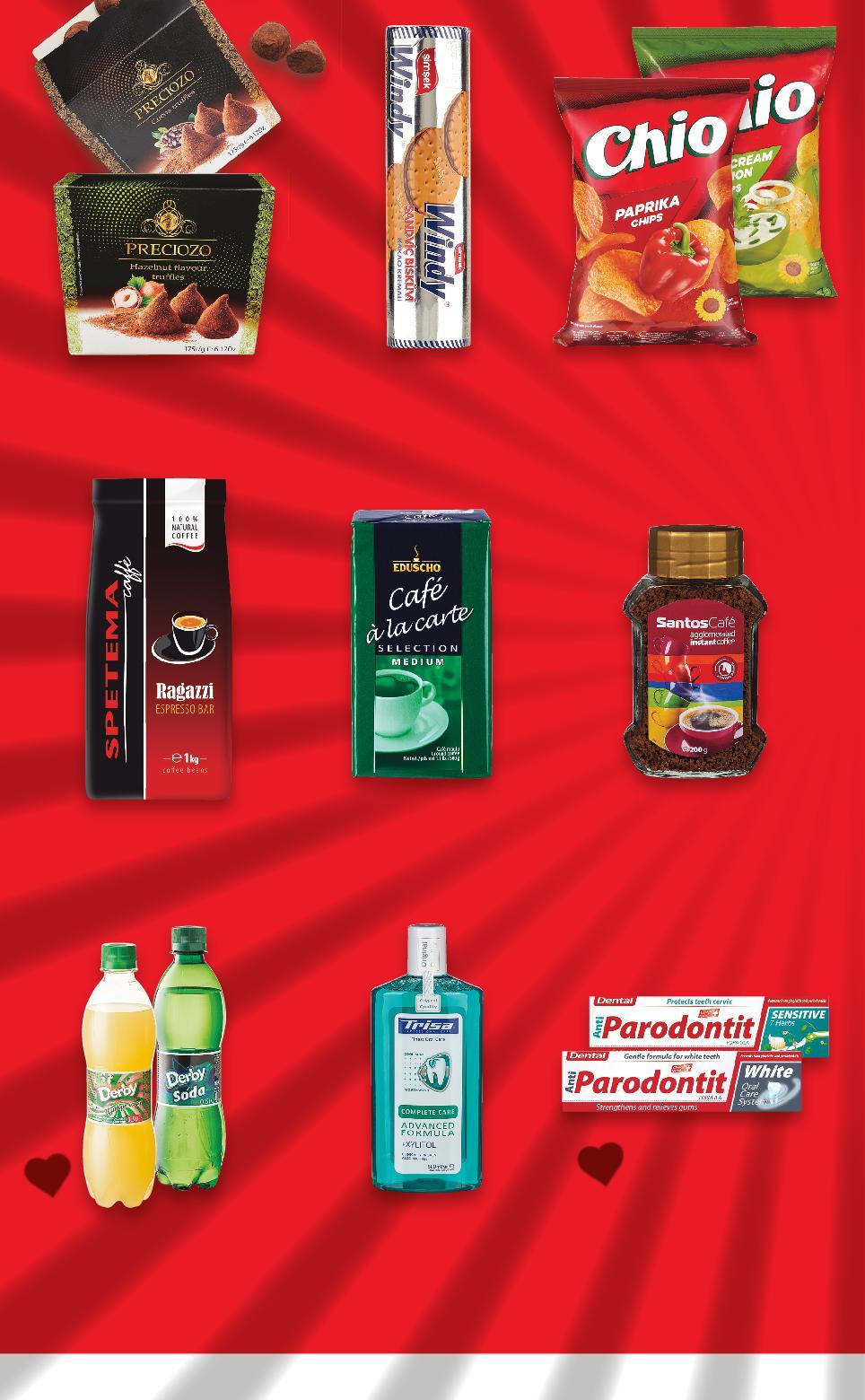 Цените са валидни за посочените на последна страница хипермаркети. Стоките се продават в количества, обичайни за едно домакинство. Всички цени са в лева с включен ДДС. Всички артикули се предлагат без декорация. Снимките са примерни. -50% 0,69 1,39 -50% 5,49 10,99 -50% 2,24 4,49 -50% 0,47 0,95 -50% 19,49 38,99 -50% 6,79 13,69 -50% 2,99 5,99 -50% 0,97 1,95 -50% 3,84 7,69 1 кг сандвичБисквитиWINDYSIMSEK с какаов крем 150 г (1 кг = 4,60) МляноEDUSCHOкафе 500 г (1 кг = 10,98) ПастаDENTALза зъби илиSensitiveAnti-ParodontitWhite 100 мл (1 л = 22,40) напиткаГазиранаDERBY различни вкусове 0,5 л PET (1 л = 0,94) KафеRAGAZZISPETEMAназърна 1 кг (1 кг = 19,49) кафеРазтворимоCAFÉSANTOS 200 г (1 кг = 33,95) ЧипсCHIO сол, паприка или сметана и лук 60 г (1 кг = 16,17) ТрюфелиPRECIOZO лешник или какао 175 г (1 кг = 17,09) ВодаTRISAза уста Complete Care или Revital Sensitive 500 мл (1 л = 7,68) S4-BG-KW34-LFT-SPAR2_L-1000-10 4
