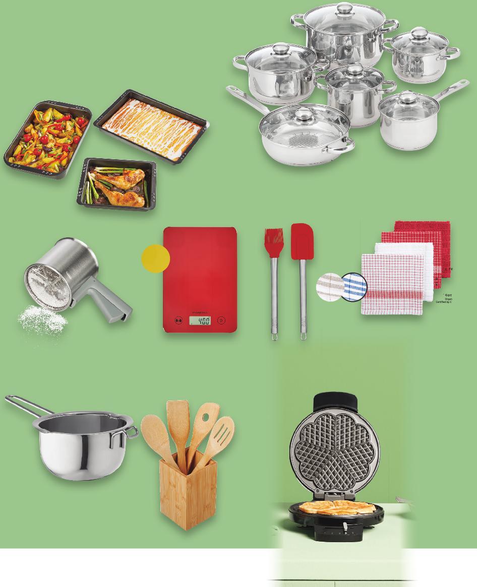 Цените са валидни за посочените на последна страница хипермаркети. Стоките се продават в количества, обичайни за едно домакинство. Всички цени са в лева с включен ДДС. Всички артикули се предлагат без декорация. Снимките са примерни. КУЛИНАРНИ УМЕНИЯ -50% 79,90 159,90 16,99* само 19,99* само 4,49* само 10,99* само 17,99* само13,99* само 8,99* само 10,99* само 3,99* само 9,99 само 15,99* 100% памук Комплект съдове за готвене със стъклени капаци, благородна стомана, касерола 1,9 л, тиган 2,6 л и тенджери: 1,9 л, 2,4 л, 3,2 л и 5,5 л Комплект тави и4228,5покритие,незалепващох23х4см,х29х4см41х26,5х6см Форма за печене доподходяща180°C ишпатулаКомплектчетка силиконови помощнициКухненски бамбук везнаКухненска LCD донатоварванедисплей,5кг Форма за кекс Ø25 подходяща2700см,мл, до 180° C Форма за 12 мъфина 38,5 x 26,5 x 3 см, 12 x 90 доподходящамл,180°C Сито пластмасастоманаблагороднаи съдовекърпиКомплектза 4 бр. 50 х 50 или 5 бр. 50 х 70 см Съд за водна баня 25,5стомана,благороднаx14x6 см, 600 мл само Ø26 см, 3000 мл 5 части 3 броя 12 части Ø20 1400см,мл Комплект съдове 3 ГОДИНИ ГАРАНЦИЯ 29,99 само Гофретник 1200покритие,незалепващоW S42-BG-KW34-LFT-NFP5_L-1000-10 42