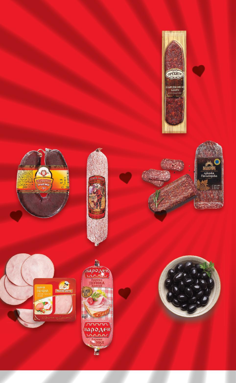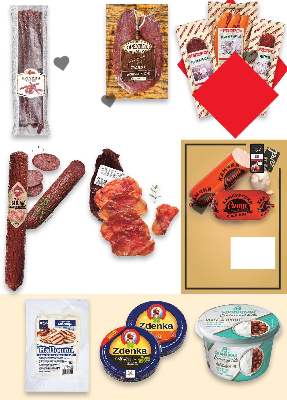 Цените са валидни за посочените на последна страница хипермаркети. Стоките се продават в количества, обичайни за едно домакинство. Всички цени са в лева с включен ДДС. Всички артикули се предлагат без декорация. Снимките са примерни. -36% 29,99 46,99 -35% 26,99 41,99 -26% 6,49 8,89 -26% 9,79 13,29 -31% 21,99 31,99 -28% 12,89 17,99 9,49 само -38% 17,89 28,89 15,99* само ЧановетеПастърма от свинско филе с подправкиароматни кг (1 кг = 29,99) Свински бут Елена чубрицапоръска40сурово-сушенднис кг (1 кг = 26,99) Наденица македонска или родопска кг (1 кг = 9,79) МедитеранеоШунка кг (1 кг = 21,99) шункаЖарена варено-пушенаВита кг (1 кг = 12,89) флейкаСвинска кг (1 кг = 9,49) Шпек Класик или сговеждоотварено-пушенБургассвинскоимесочесън кг (1 кг = 17,89) Кренвирши кг (1 кг = 6,49) Луканка кг (1 кг = 15,99) КОЛБАСИ ОТ ВИТРИНА С ОБСЛУЖВАНЕ стърготиниопушенавкуссредиземноморскинабукови 100 г са произведени от 135 г свинско филе опушена с широколистна дървесина S12-BG-KW34-LFT-BED2_L-1000-10 12