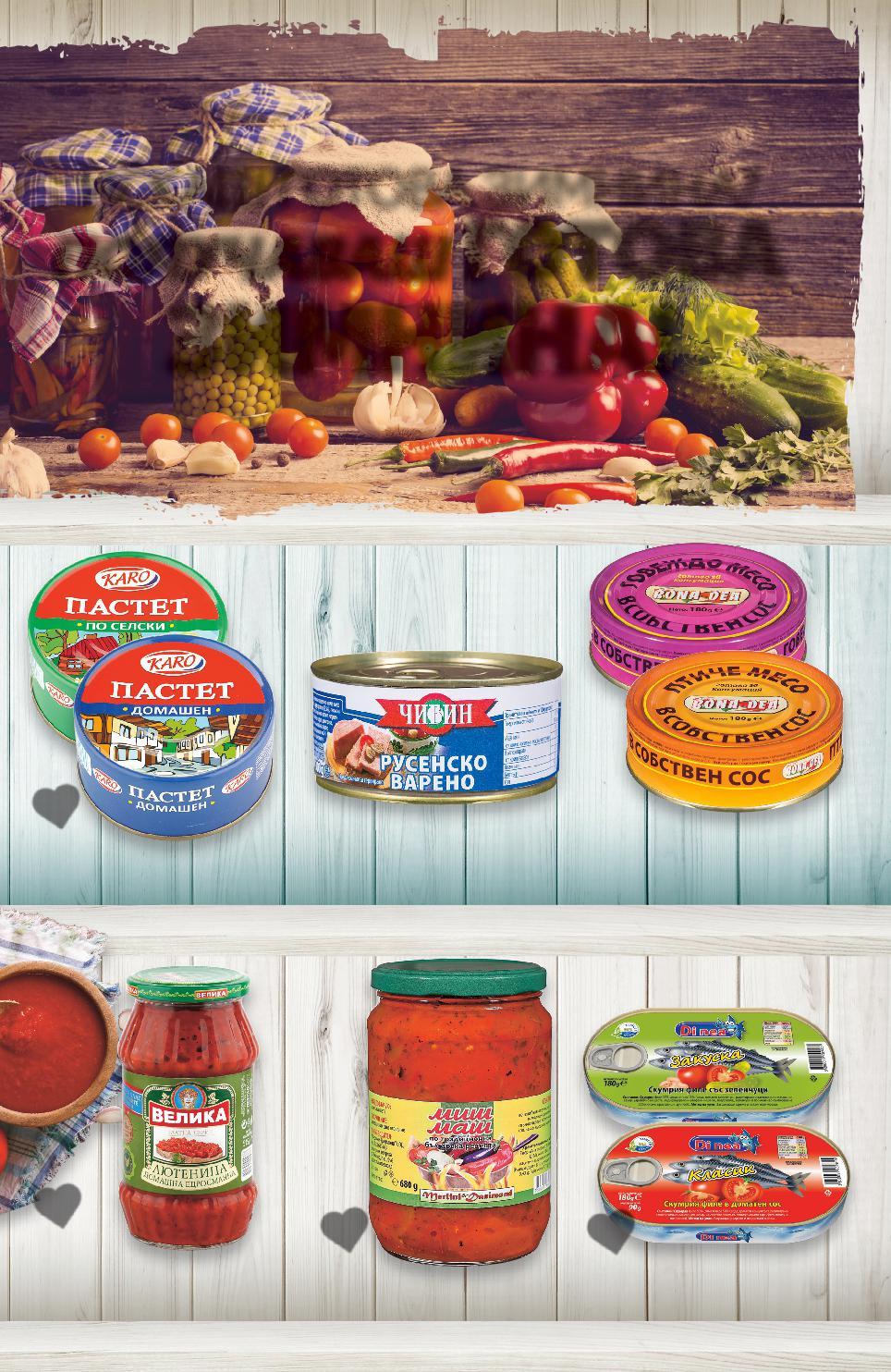ИСКАШ ГОТОВА ЗИМНИНА? ПОЛУЧАВАШ ГОТОВА ЗИМНИНА! КОНСЕРВИ Цените са валидни за посочените на последна страница хипермаркети. Стоките се продават в количества, обичайни за едно домакинство. Всички цени са в лева с включен ДДС. Всички артикули се предлагат без декорация. Снимките са примерни. 2,29* само -33% 1,79 2,69 -32% 5,99 8,89 -31% 3,99 5,79 -40% 1,59 2,69 -37% 2,49 3,99 DI СкумрияNEA филе различни видове 180 г (1 кг = 12,73) ПастетKARO домашен или по селски 300 г (1 кг = 5,97) лютеницаДомашнаВЕЛИКА безедросмлянаконсерванти 515 г (1 кг = 11,64) Миш-машDANIMONDMERLINI 680 г (1 кг = 5,87) BONA месоилиПтиче,DEAсвинскоговеждо в собствен сос 180 г (1 кг = 13,84) вареноРусенскоЧИБИН 300 г (1 кг = 5,30) S22-BG-KW34-LFT-KONS_L-1000-10 22