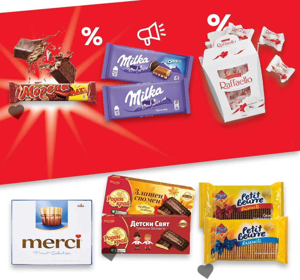 ЗАХАРНИ ИЗДЕЛИЯ Отстъпката с Kaufland Card e изчислена спрямо стандартната текуща цена, на която продуктът се предлага в хипермаркета.Ценитесавалидни за посочените на последна страница хипермаркети. Стоките се продават в количества, обичайни за едно домакинство. Всички цени са в лева с включен ДДС. Всички артикули се предлагат без декорация. Снимките са примерни. Отстъпката с Kaufland Card e изчислена спрямо -40% 0,45 0,75 -28% 0,89 1,25 -28% 4,29 5,99 -39% 2,29 3,79 -25% 1,79 2,39 -25% 6,29 8,49 -35% 1,89 2,95 -21% 7,49 9,59 -27% 1,89 с2,59 2,59 амо само вафлаТункванаMAXXМОРЕНИ 49 г (1 кг = 9,19) ЛокумВРЕМЕНАСЛАДКИ различни видове 140 г (1 кг = 6,36) ВафлиНАЯ класик, какао или мляко с какао 28 бр. в опаковка 600 - 653 г (1 кг = от 6,57) SWEET БисквитиWAY Petit класикBeurreиликакао 400 г (1 кг = 5,73) бисквитиТункваниРОДЕНПРЕСТИЖКРАЙ Златен спомен, Детски свят или Кафе 135 г (1 кг = 13,26) бонбониШоколадовиMERCI различни видове 210 - 250 г (1 кг = от 25,16) БонбониRAFFAELLO кокос 230 г (1 кг = 32,57) ШоколадMILKA различни видове 87 - 100 г (1 кг = от 18,90) BAHLSEN HIT различнисандвичБисквити видове 220 г (1 кг = 8,60) Цена CARDKAUFLANDс S24-BG-KW34-LFT-SUSS_L-1000-10 24