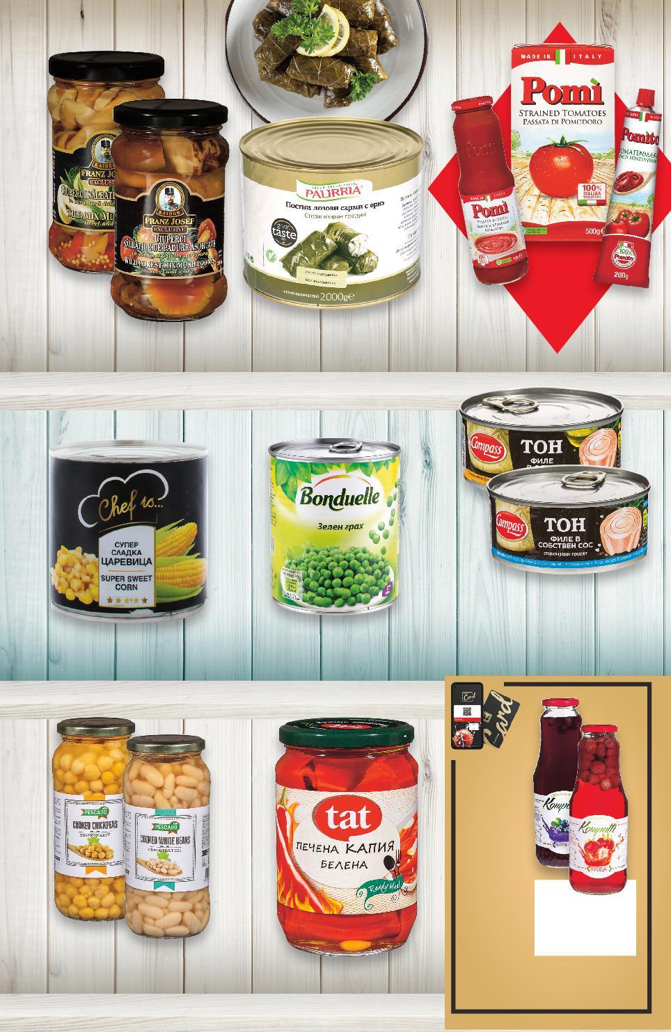 *Със звездичка са обозначени артикулите, които са специално предложение до изчерпване на наличностите. Kaufland не носи отговорност за печатни грешки. -25% ОТСТЪПКА ЗА ПРОДУКТИВСИЧКИСМАРКАPOMI 2 кг -31% 12,99 18,99 -42% 2,69 4,69 -25% 2,99 3,99 -30% 3,49 4,99 -26% 1,69 2,29 -30% 3,29 4,75 -36% 1,99 3,15 Отстъпката с Kaufland Card e изчислена спрямо стандартната текуща цена, на която продуктът се предлага в хипермаркета. -33% 3,99 с5,99 5,99 амо само сармиЛозовиPALIRRIA 60 бр. 2 кг (1 кг = 6,50) ПеченаTAT капия белена, овкусена 670 г (1 кг = 4,02) ГъбиFRANZKAIZER различни видове 280 г (1 кг = 10,68) млеченЗеленBONDUELLEграх 800 г (1 кг = 4,37) CHEF царевицаСладкаIS... 340 г (1 кг = 4,98) РибаCOMPASSтонфиле в собствен сос или в олио 160 г (1 кг = 20,57) НахутБялPESCADOбобили 540 г (1 кг = 3,69) 1видоверазличнипиенеКомпотKOMPOTTIзал(1л=3,99) Цена CARDKAUFLANDс S23-BG-KW34-LFT-KONS_R-1000-10 23