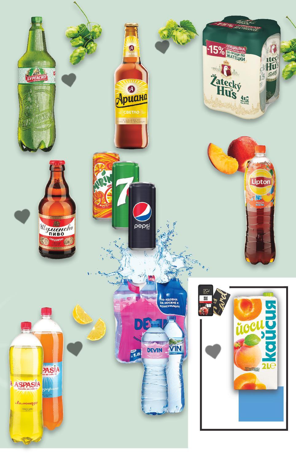 Отстъпката с Kaufland Card e изчислена спрямо стандартната текуща цена, на която продуктът се предлага в хипермаркета. *Със звездичка са обозначени артикулите, които са специално предложение до изчерпване на наличностите. Kaufland не носи отговорност за печатни грешки. 2 литра 6x1,8 литра ПРОМОПАКЕТ НАД 350 БЕЗАЛКОХОЛНИ НАПИТКИ И БИРИ ЩЕПРИНАМЕРИШНАС -41% 1,99 3,392вкусоверазлични12%напиткаПлодоваJOOCYплод,л(1л=1,00) Цена CARDKAUFLANDс 2 литра 1,89 само БираБУРГАСКО 4,4% vol 2 л РЕТ (1 л = 0,95) 2 литра -31% 0,89 1,29 -28% 3,99 5,59 3,89 само -50% 0,89 1,79 -37% 1,79 2,85 -38% 0,79 1,29 -37% 0,59 0,95 4x0,5 литра БираАРИАНА 4,5% vol * Цената не включва амбалаж * Цена амбалажна0,10 лв. 0,5 л бутилка (1 л = 1,78) ZATECKY HUS Бира 5 % Vol. 4 x 0,5 кен (1 л = 2,00) ВодаDEVIN изворна минералнаили 6 х 1,8 л (1 л = 0,37) напиткаГазиранаASPASIA различни вкусове 2 л РЕТ (1 л = 0,45) СтуденLIPTONчай различни видове 1,5 л (1 л = 1,20) напиткаГазирана7MIRINDA/PEPSI/UP видоверазлични 0,33 л кен (1 л = 2,40) БираСпециалноШУМЕНСКО 5,2% vol * Цената не 0,10амбалаж*амбалажвключваЦенаналв. 0,33 л бутилка (1 л = 1,79) БЕЗАЛКОХОЛНИ НАПИТКИ И БИРА S29-BG-KW34-LFT-GEP_R-1000-10 29