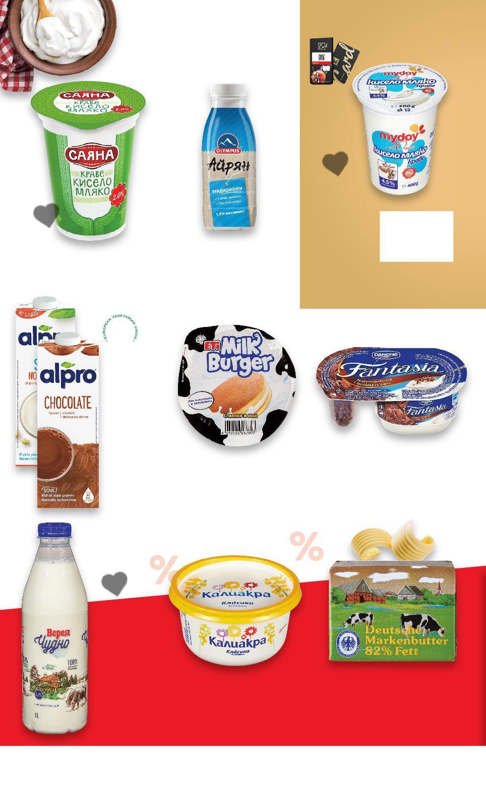 Отстъпката с Kaufland Card e изчислена спрямо стандартната текуща цена, на която продуктът се предлага в хипермаркета. Цените са валидни за посочените на последна страница хипермаркети. Стоките се продават в количества, обичайни за едно домакинство. Всички цени са в лева с включен ДДС. -20% 0,95 1,19 -32% 4,99 7,39 -30% 1,59 2,29 -20% 1,19 1,49 -24% 0,75 0,99 -22% 0,85 1,09 4,59 -20% 2,49 3,15 само -36% 0,99 1,55 само с1,55 амо млякоКиселоСАЯНА 2% масленост 400 г (1 кг = 2,38) мазанеПродуктKЛАСИКАКАЛИАКРАза 250 г (1 кг = 6,36) десертМлеченFANTASIADANONE различни видове 100 - 106 г (1 кг = до 11,90) МилкETI бургер с млечен крем с ягодамед, или какао 35 г (1 кг = 21,43) АйрянOLYMPUS 330 мл (1 л = 2,58) КравеMARKENBUTTERDEUTSCHEмасло 82% масленост 250 г (1 кг = 19,96) млякоПрясноЧУДНОВЕРЕЯ 3,7% масленост 1 л (1 л = 2,49) НапиткаALPRO соева неподсладенаилинеподсладенаилишоколадванилия,сбадемава 1 л (1 л = 4,59) MY 4004,5%КиселоDAYмлякомасленостг(1кг=2,48) Цена CARDKAUFLANDс МЛЕЧНИ И РАСТИТЕЛНИ ПРОДУКТИ S20-BG-KW34-LFT-NMP1_L-1000-10 20